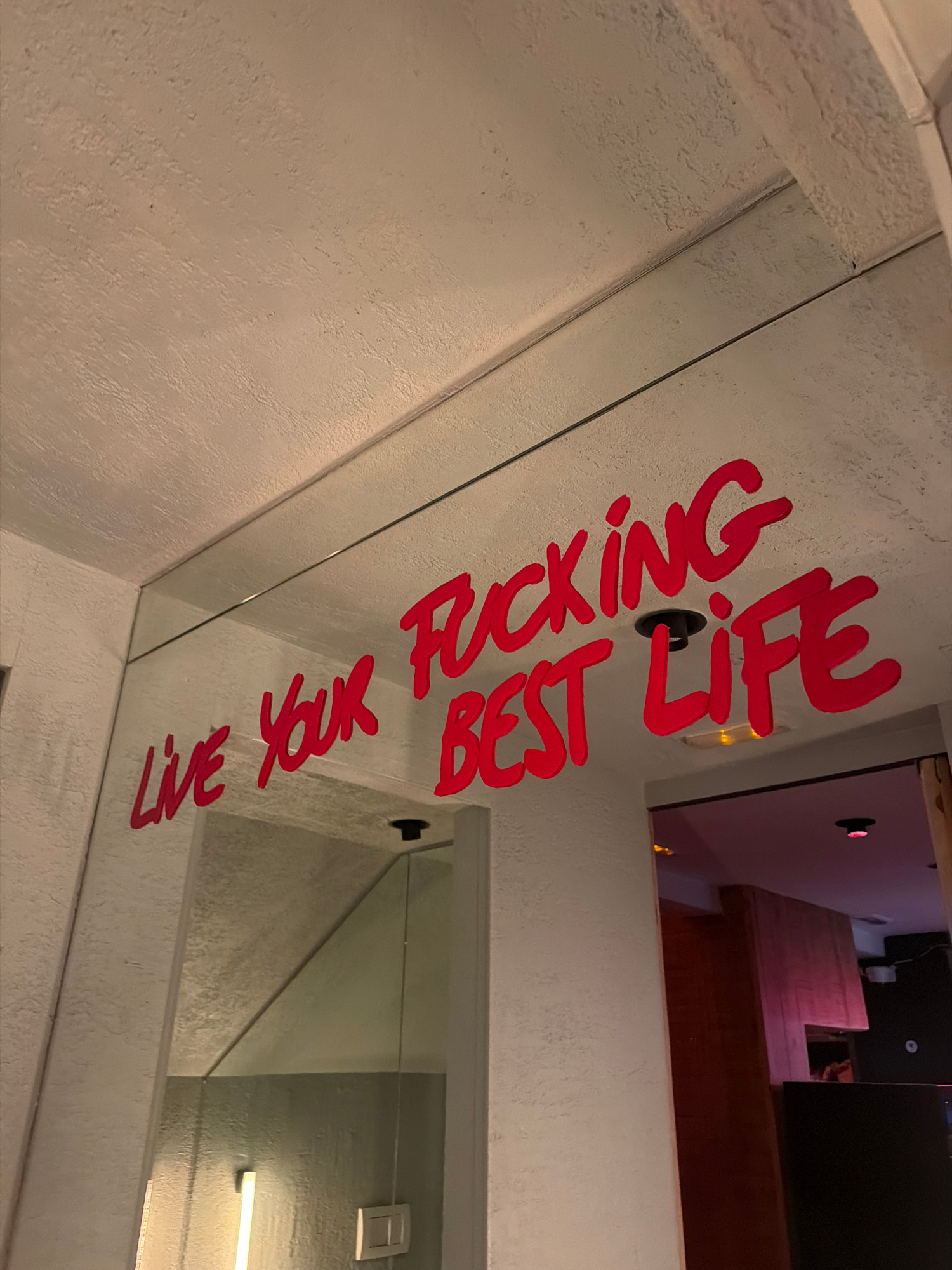 The image shows a bathroom mirror in what appears to be a commercial establishment. Bold, red graffiti-style lettering is applied directly on the mirror’s surface, reading "LIVE YOUR FUCKING BEST LIFE…read more