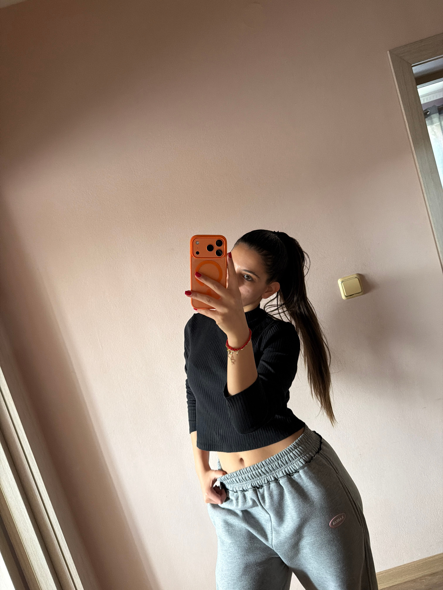 A woman is standing indoors, taking a selfie in what appears to be a bedroom or similar living space. She is holding a smartphone with an orange case in her right hand. The woman has dark hair pulled…read more