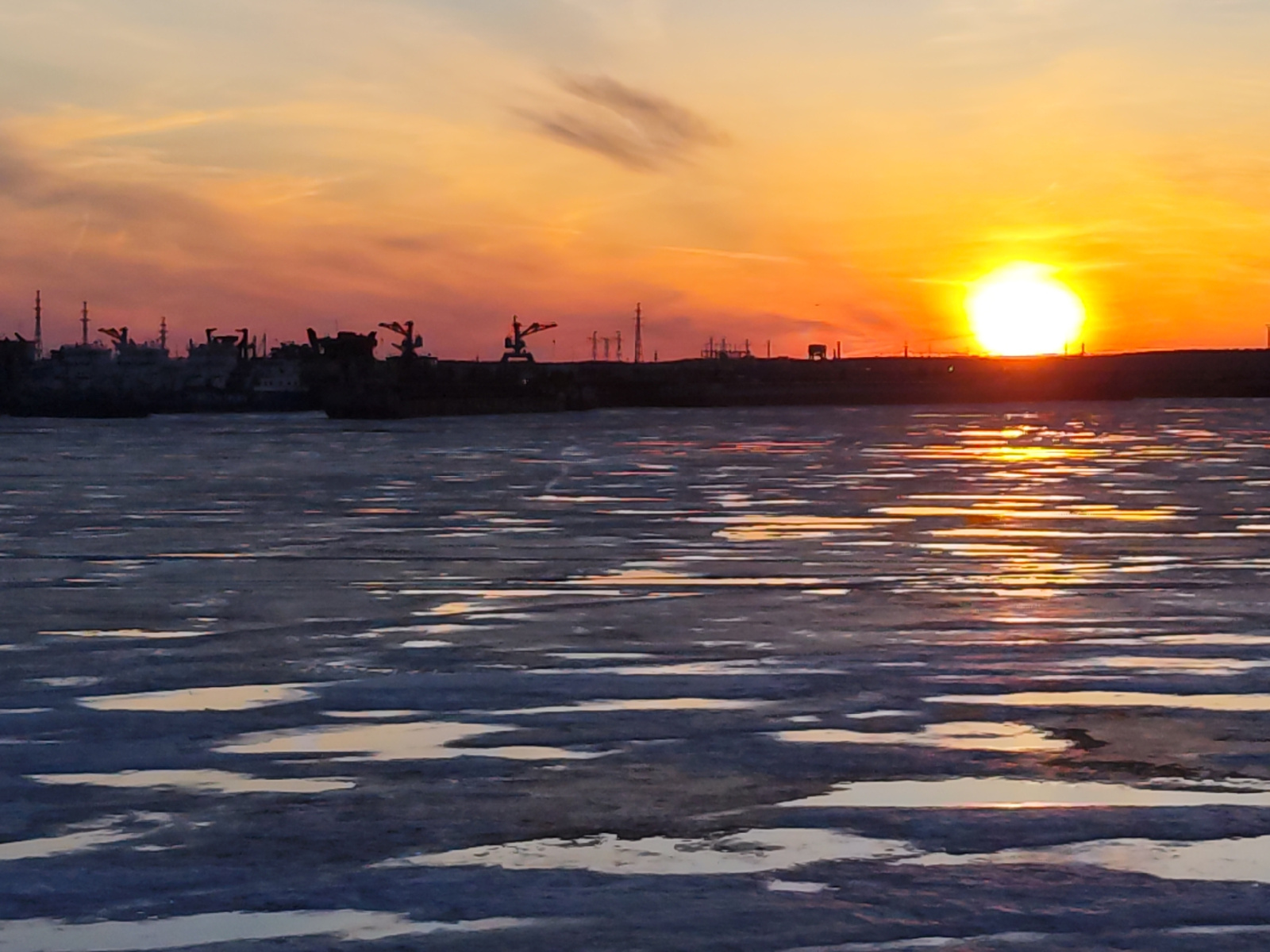 The image shows a sunset over a body of water in Chaikovsky, Russia. The sun is setting on the horizon, reflecting light on the water surface with patches of ice. The shoreline shows silhouettes of wh…read more
