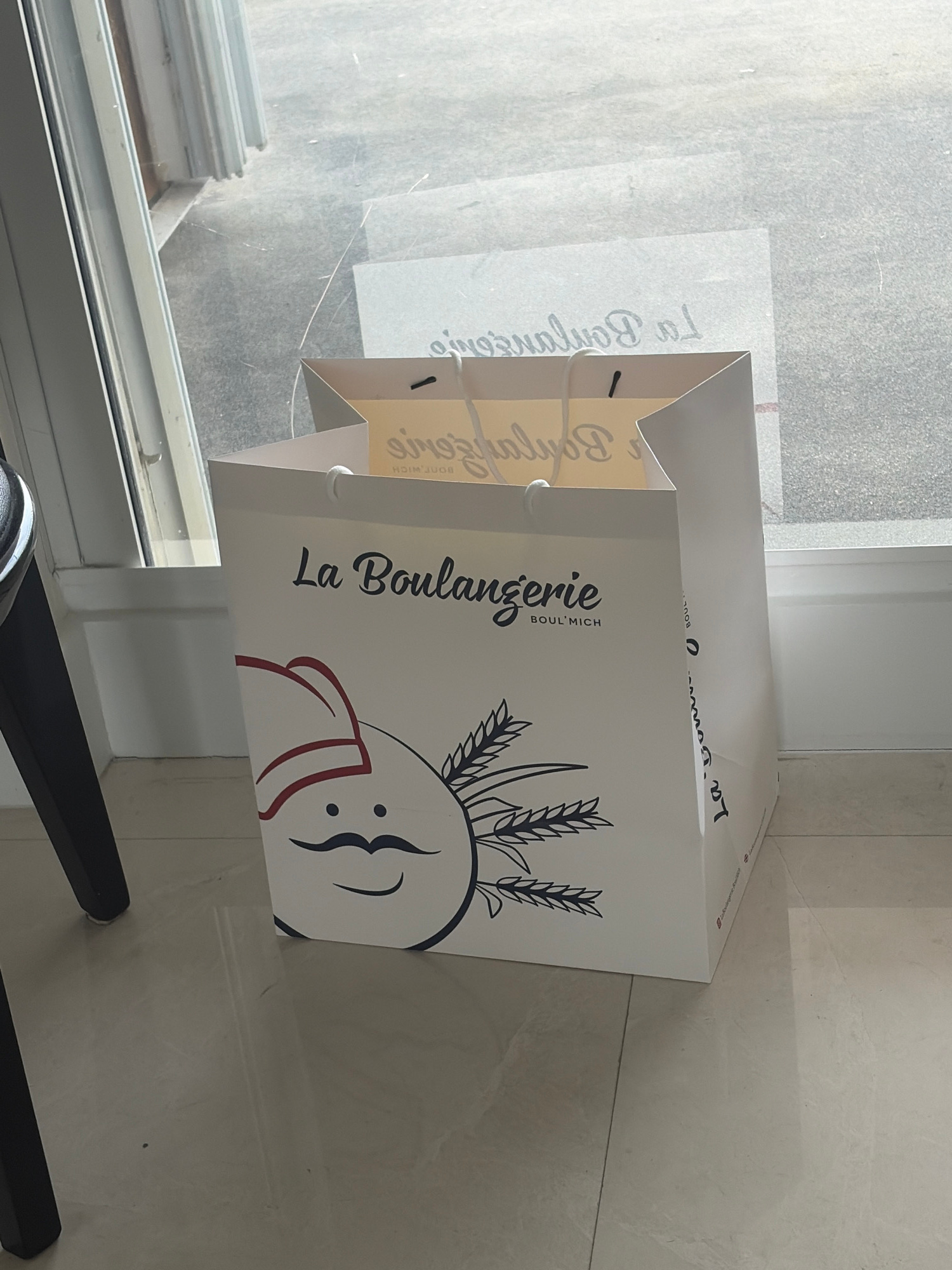A "La Boulangerie Boul'Mich" bakery bag is partially visible in the frame. The bag is predominantly white with the bakery's name printed vertically in black on the side. Adjacent to the name is a styl…read more