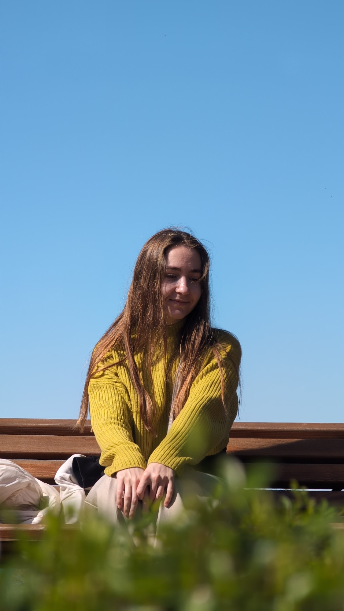 The image shows a young woman sitting on a wooden bench. She has long brown hair and is wearing a yellow sweater. She is sitting with her hands resting on her legs. Behind her, there is a bright blue…read more