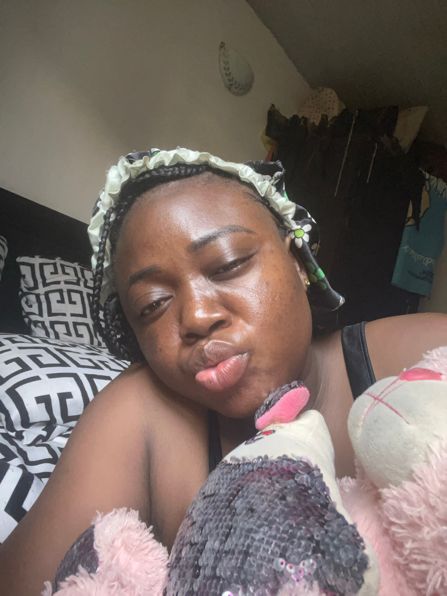A close-up, angled portrait features a dark-skinned individual, likely a female, lying down indoors, possibly in a bedroom in Abuja, Nigeria. Her eyes are mostly closed, and she displays a playful "du…read more