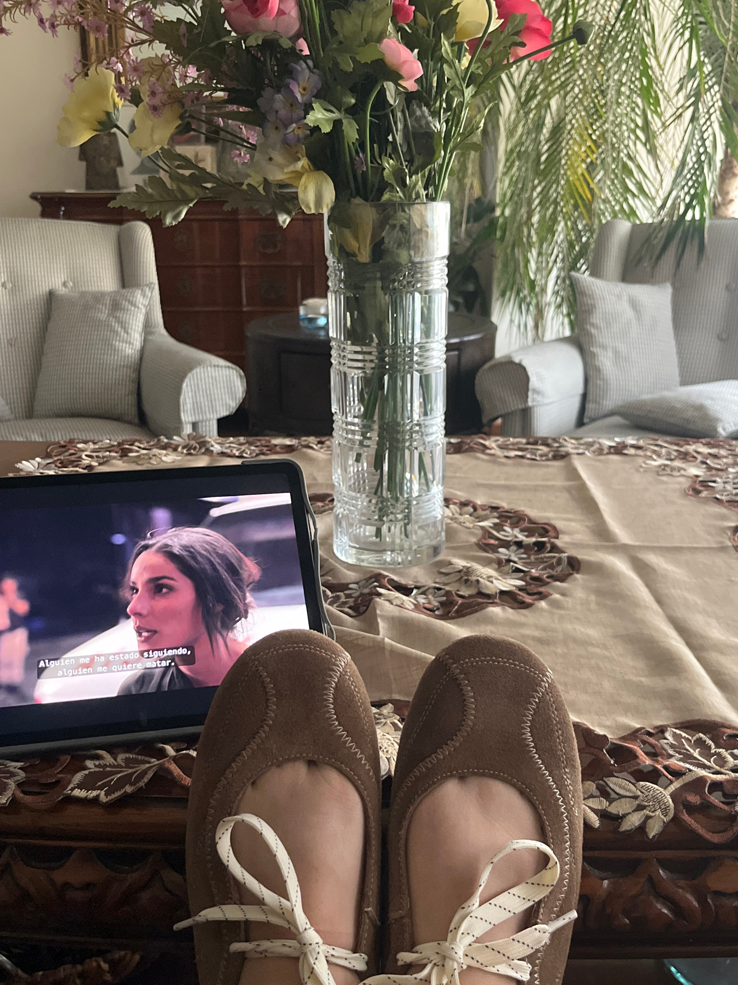 A low-angle, indoor shot depicts a person's feet wearing brown suede shoes with white laces, resting near a tablet displaying a woman's face. The tablet sits on a wooden table with intricate carvings…read more