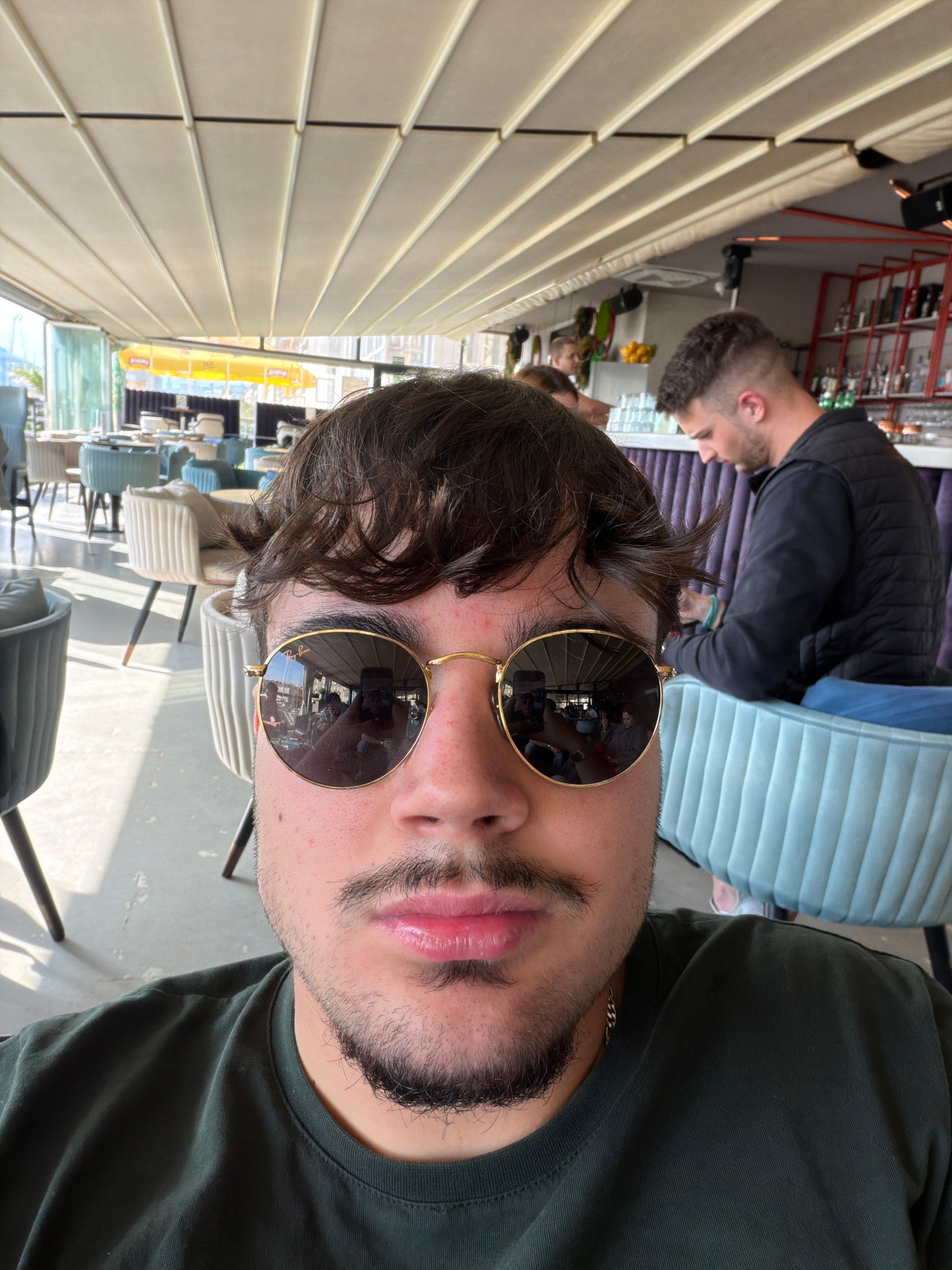 The image shows a selfie taken indoors, likely in a cafe or restaurant. The main subject is a person wearing round, gold-rimmed sunglasses that reflect the interior of the establishment, including tab…read more