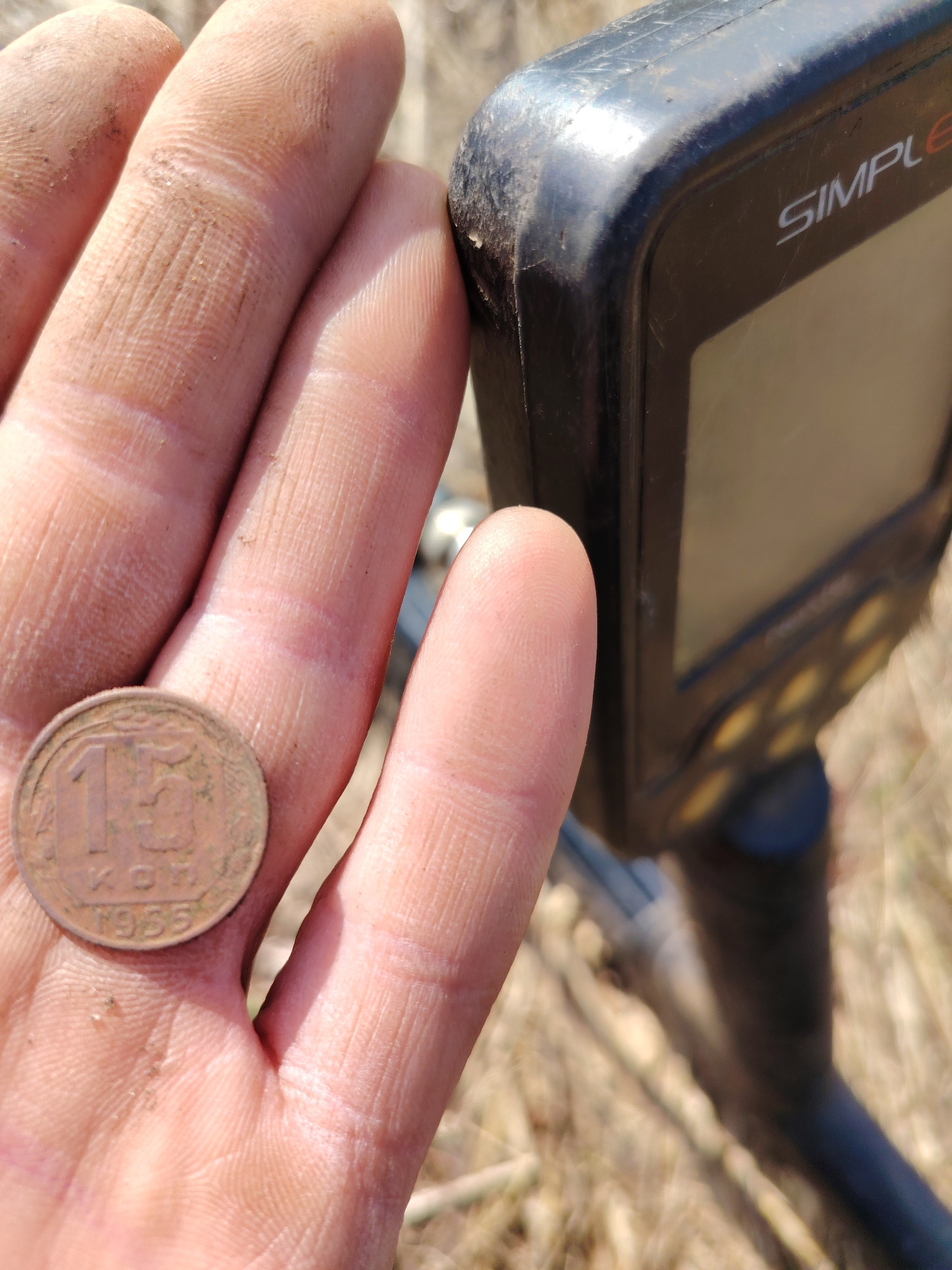 A close-up shot captures a dirt-stained hand holding an old coin, with a metal detector partially visible in the background. The hand is covered in light brown soil and dust, particularly on the finge…read more
