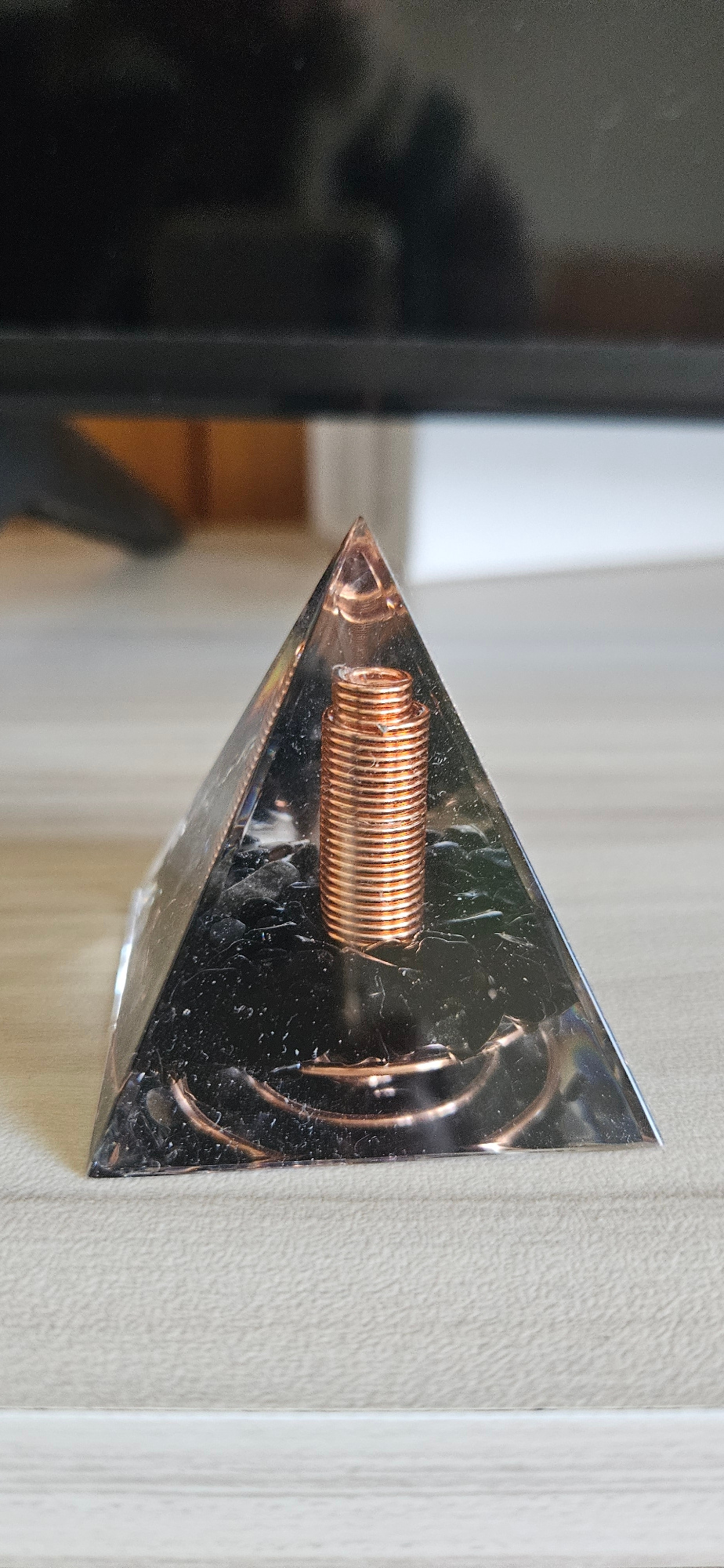 The image depicts a pyramid-shaped object with a copper coil inside, mounted on a wall. The object appears to be made of a transparent material, possibly resin or glass. The wall is light-colored and…read more