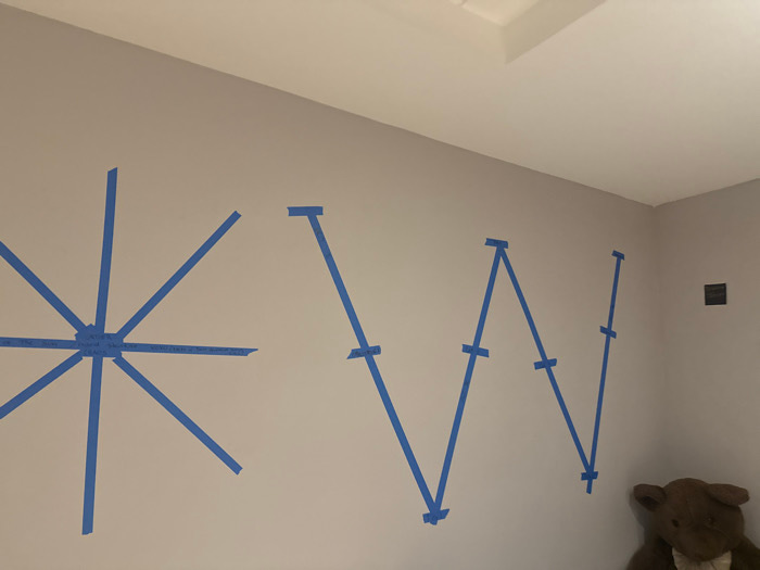 A light gray wall displays blue painter's tape outlining what appears to be the letters "KW" stylized. The "K" is constructed with multiple lines emanating from a central point, creating a starburst eā¦read more