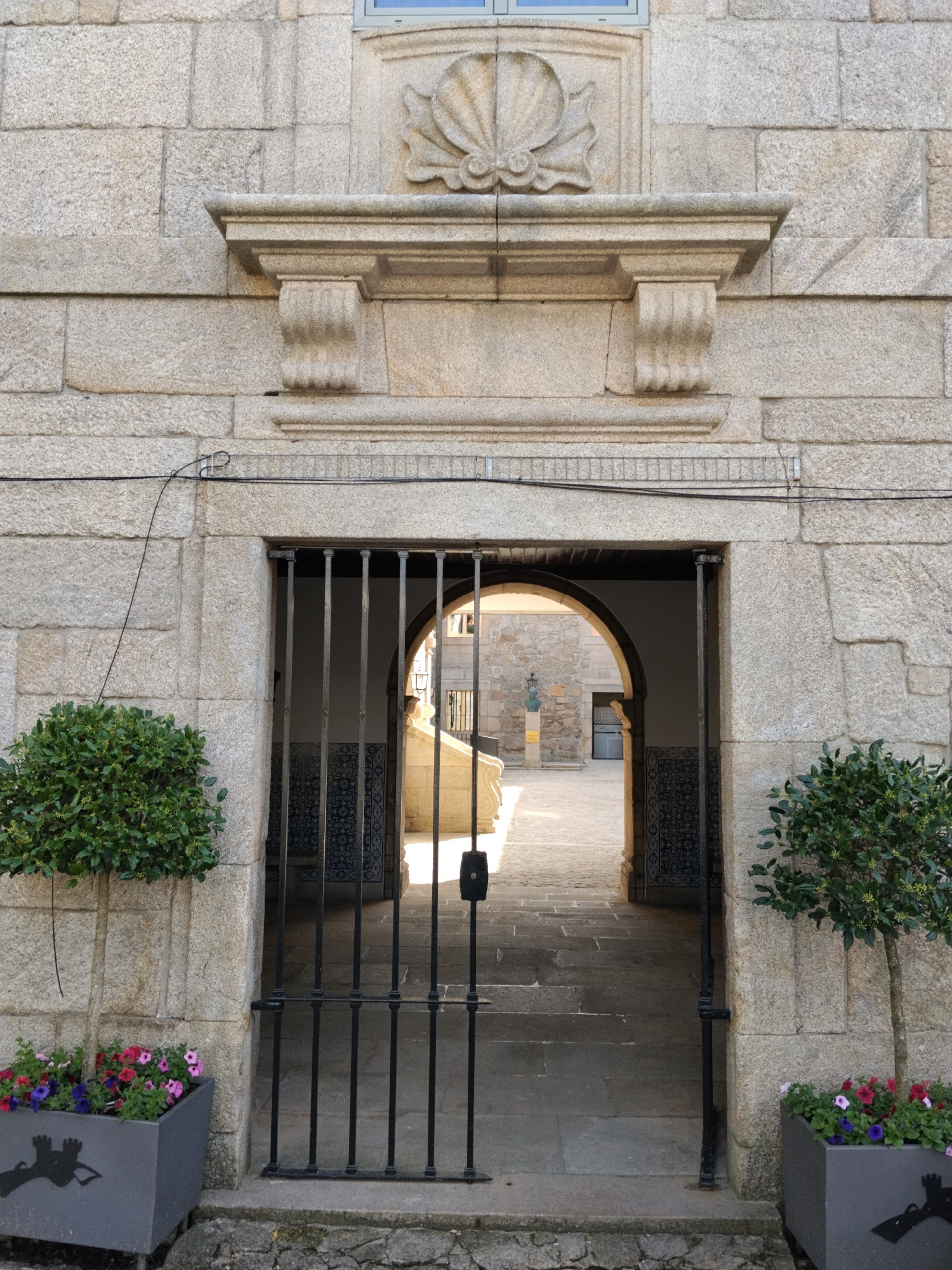 The image shows an entrance to a courtyard in Penedono, Portugal. The structure is built of large, light-colored granite blocks. Above the arched opening is a decorative element with a scallop shell m…read more