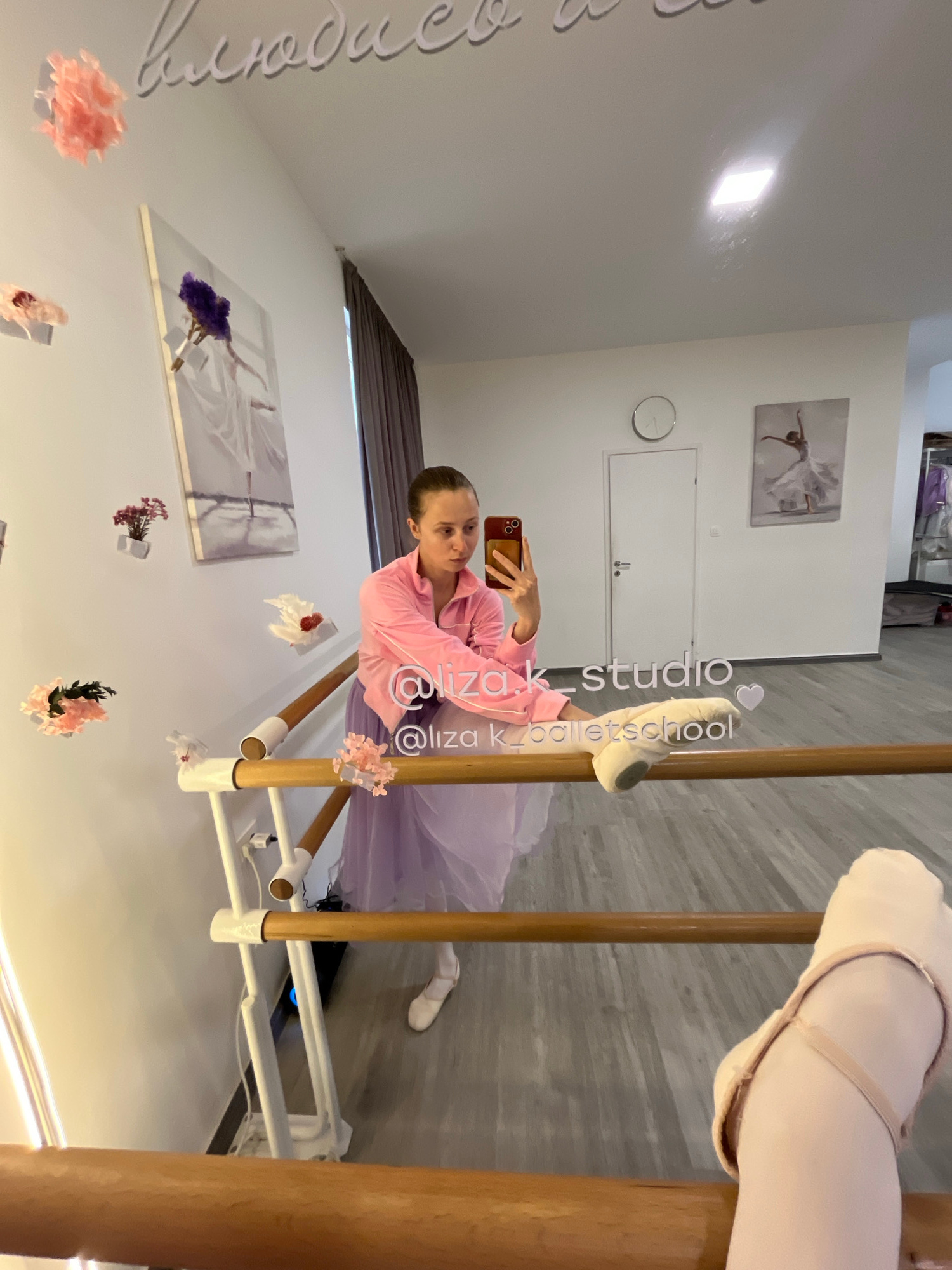 A young woman is taking a selfie in a ballet studio. She is wearing a pink pajama shirt and a light purple tutu. Her right leg is extended in a ballet position and is resting on a barre. She is holdin…read more