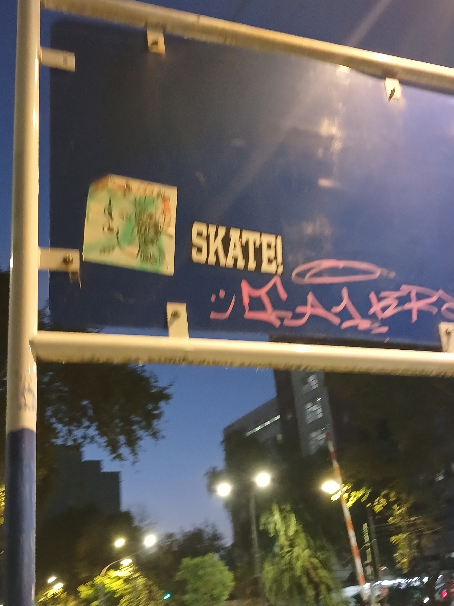 The photograph, likely taken in the city of Buenos Aires, Argentina, shows a blue metal signpost covered with graffiti and stickers. The graffiti includes the word "SKATE!" in bold, black letters, as…read more