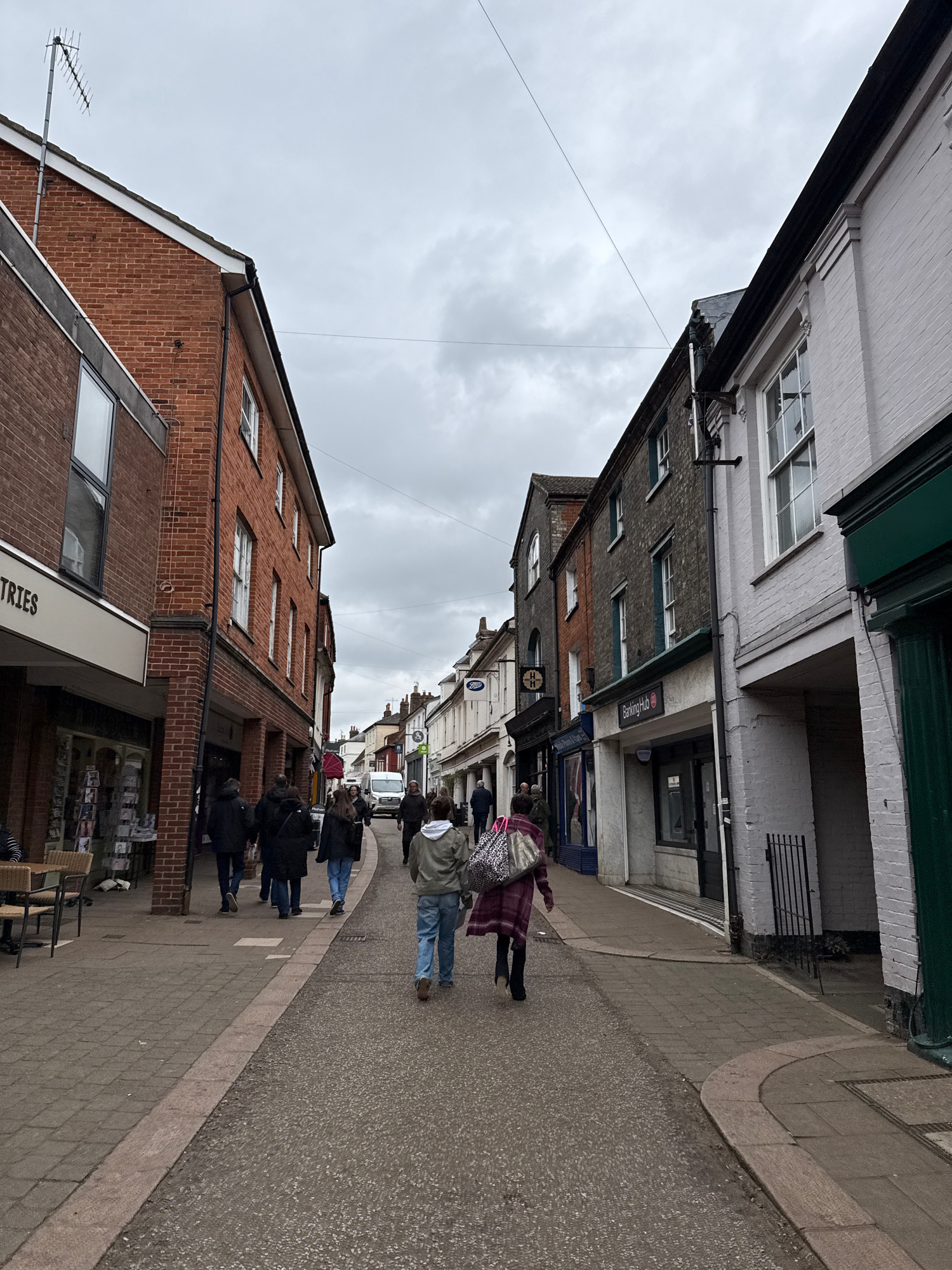 The image depicts a street scene in East Suffolk, United Kingdom. The street is lined with brick and painted buildings of varying heights and architectural styles. Several people are walking along the…read more