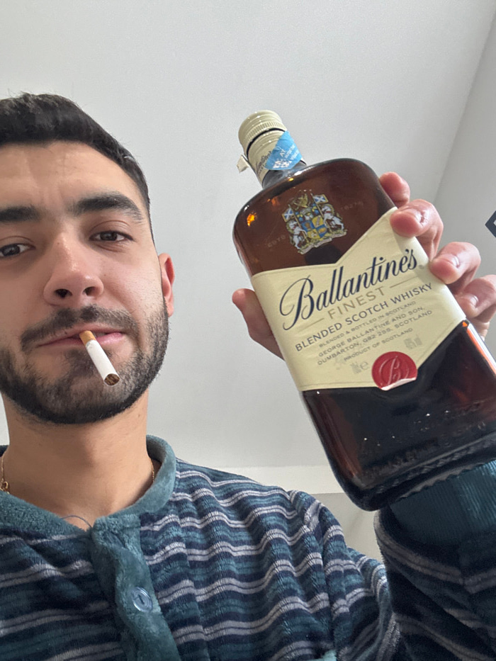 An upward-angled, close-up image depicts a male subject indoors, looking directly at the camera. He has dark hair, a beard, and a mustache. A white, unlit cigarette with a brown filter is positioned b…read more