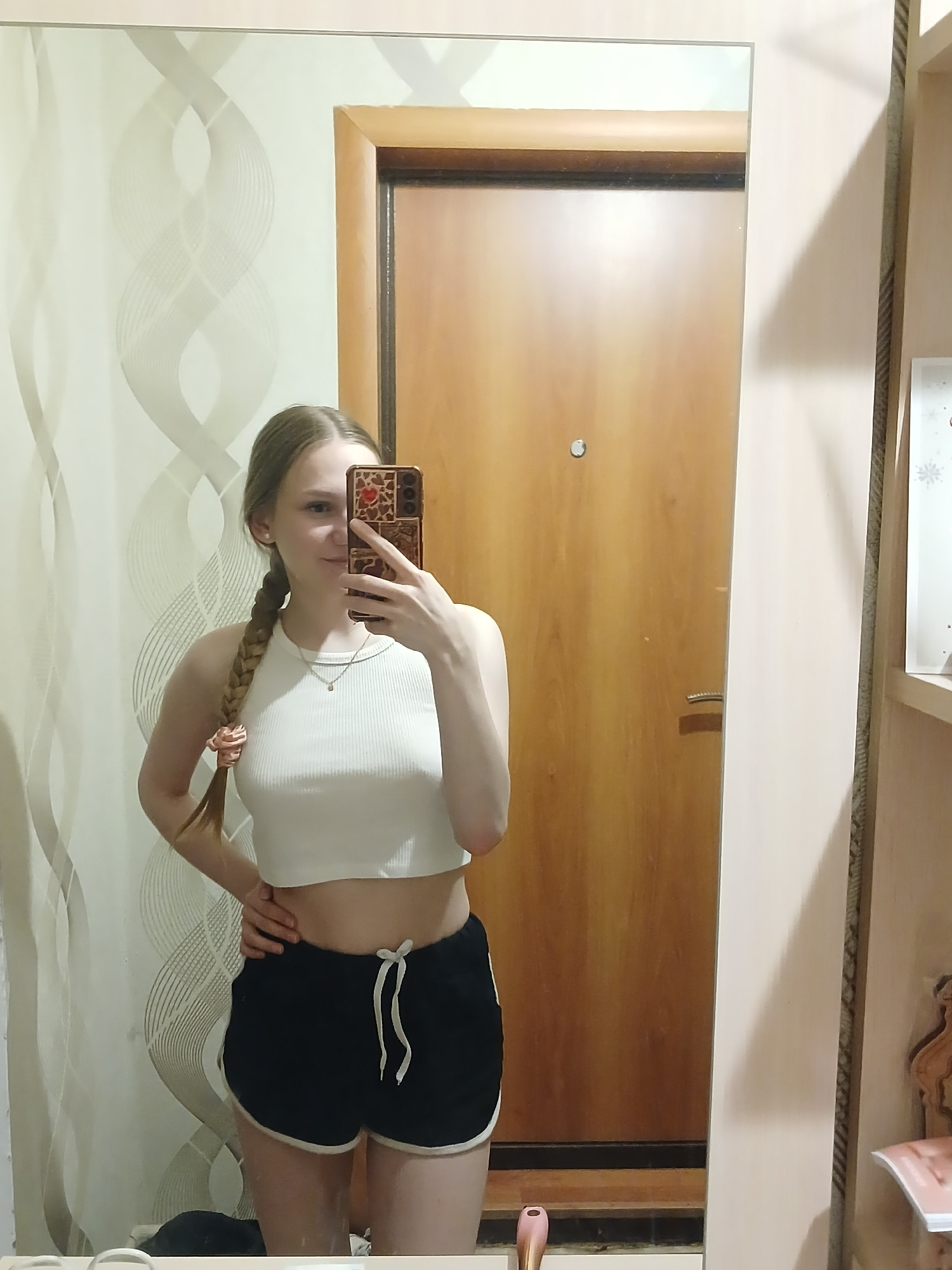 A young woman is taking a selfie in front of a mirror. The mirror reflects a room with a wooden door and a wall with decorative patterns. The woman is wearing a white top and dark shorts with white tr…read more