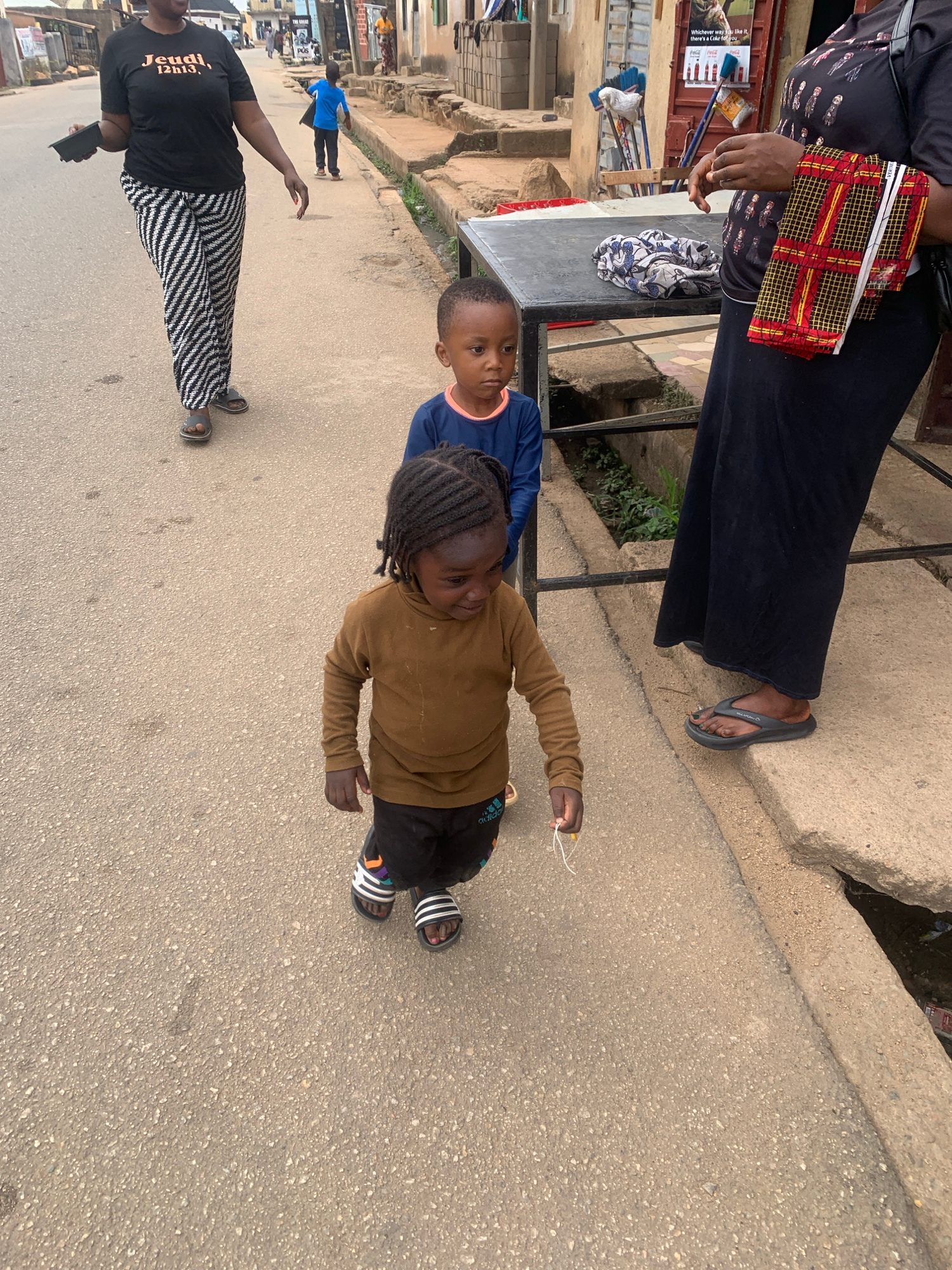 The image depicts an outdoor scene in what appears to be a street in Jos, Nigeria. The street is paved with concrete. In the foreground, two children are visible. One is wearing a brown long-sleeved…read more