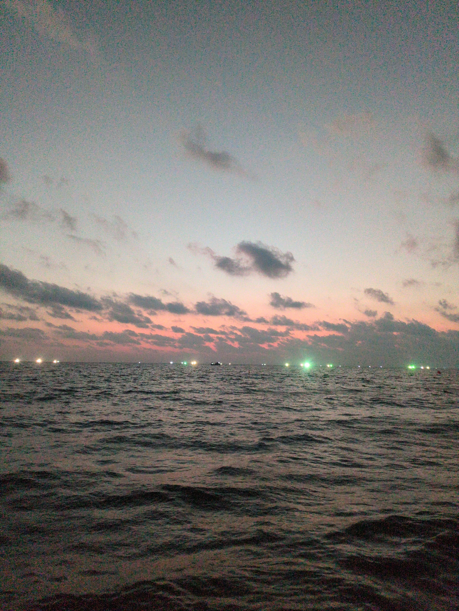 The image depicts a view of the sea at sunset from Phú Quốc, Vietnam. The sky is a mix of gray and pink hues with scattered clouds. The water surface is dark and rippled. In the distance, a line of li…read more
