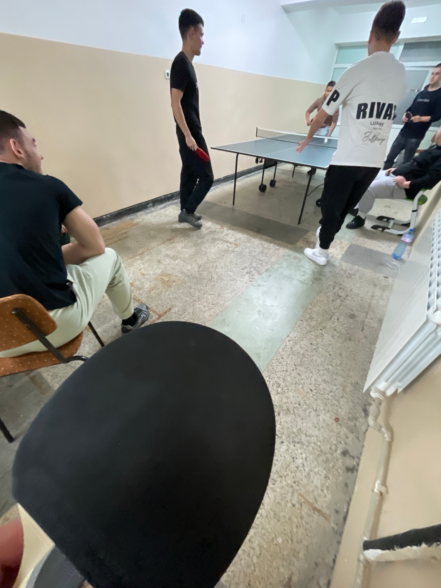 A group of people are playing ping pong indoors. One person is hitting the ball while another observes. A seated individual is in the foreground. The location is possibly in Zlatograd, Bulgaria, but t…read more