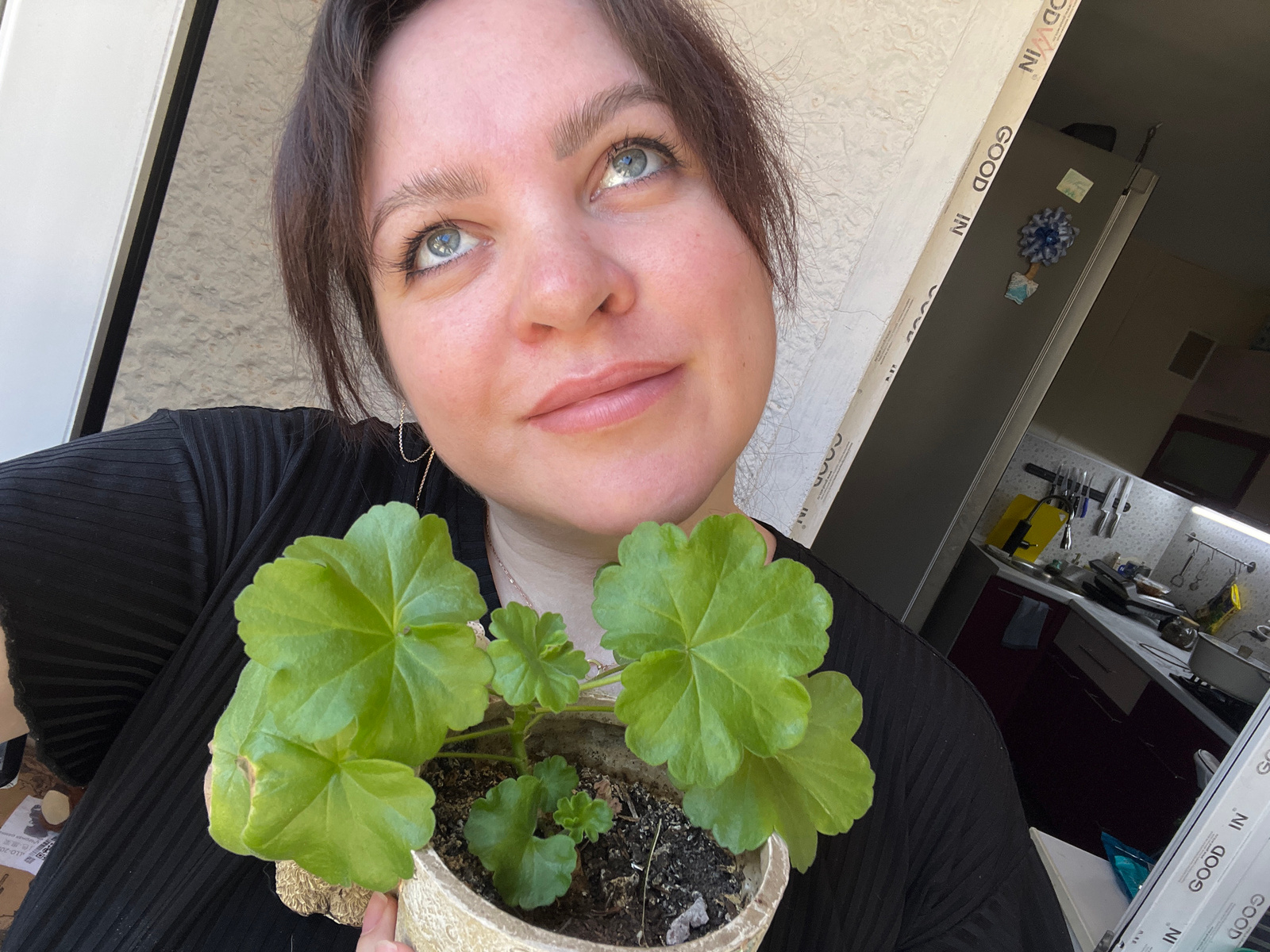 A person is holding a potted plant in front of their face. The person has light skin, light eyes, and dark hair. They are wearing a black shirt. The plant has green leaves. The background includes a w…read more