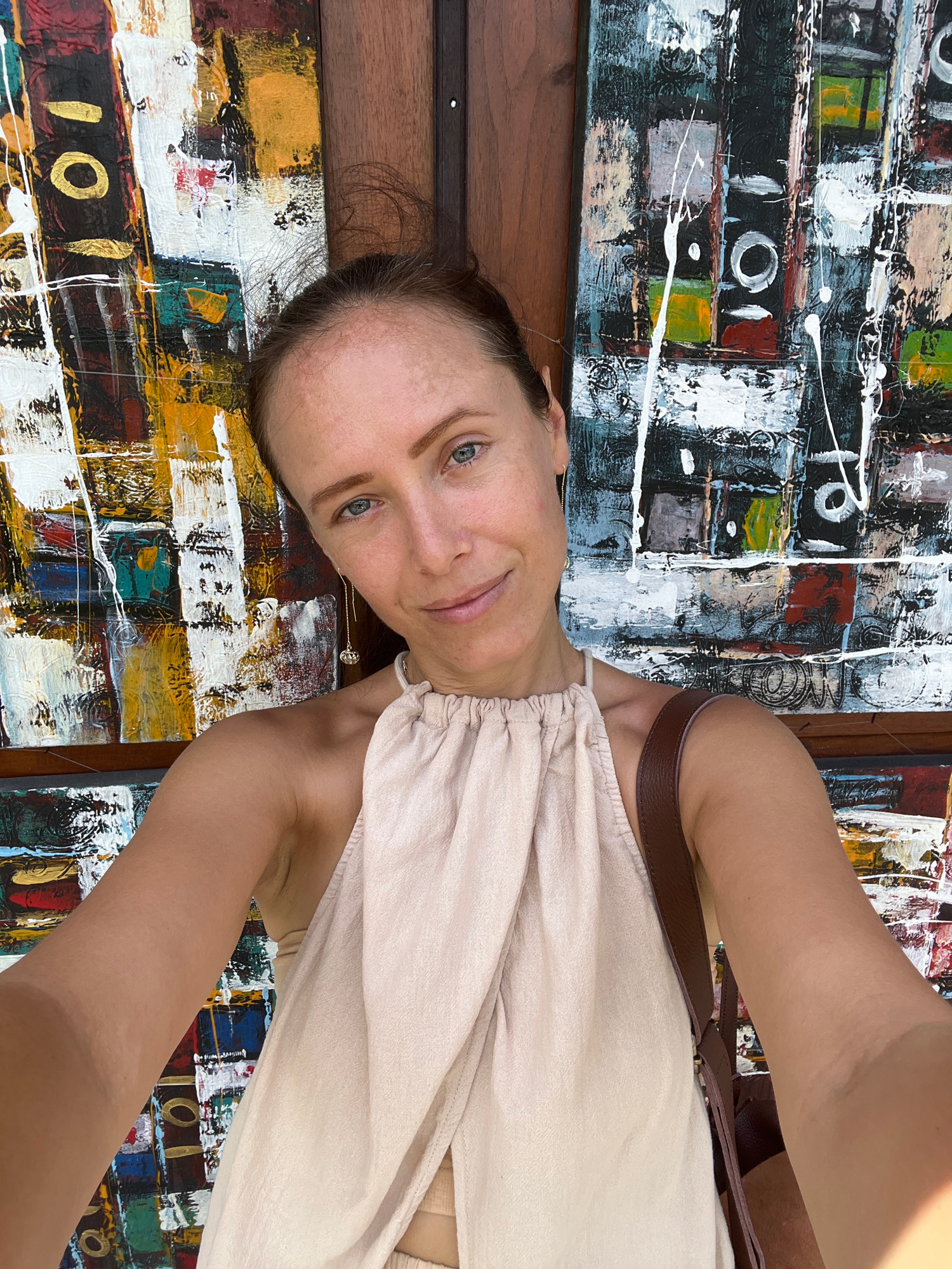 A woman with fair skin and blue eyes is taking a selfie in front of a piece of abstract art. The artwork is colorful, with blocks of yellow, black, white, red, green, and blue paint, along with splashβ¦read more