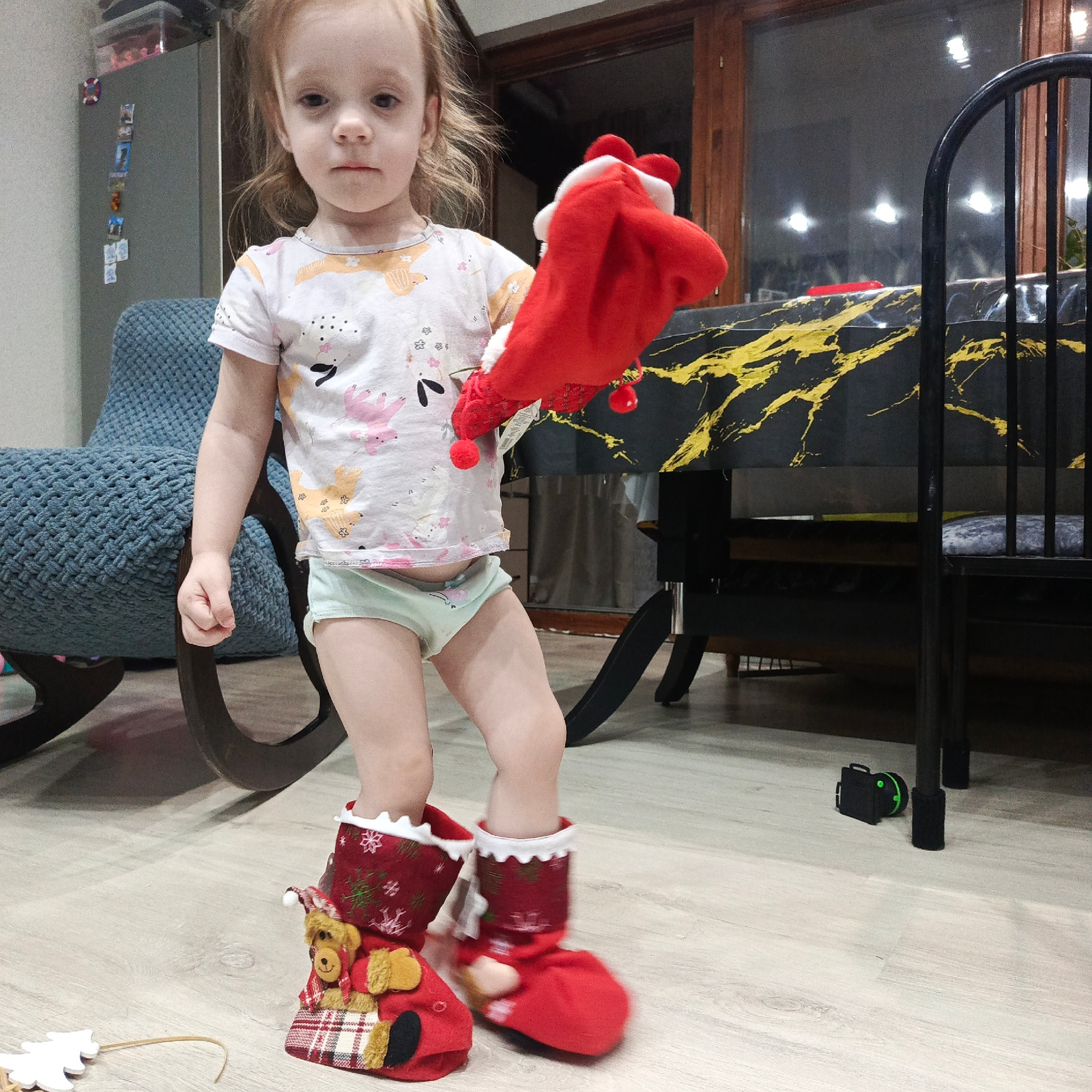 A toddler stands indoors in Марковский, Russia, wearing a patterned t-shirt and underwear, with Christmas stockings on their feet and holding another Christmas stocking in their hand. A blue rocking c…read more