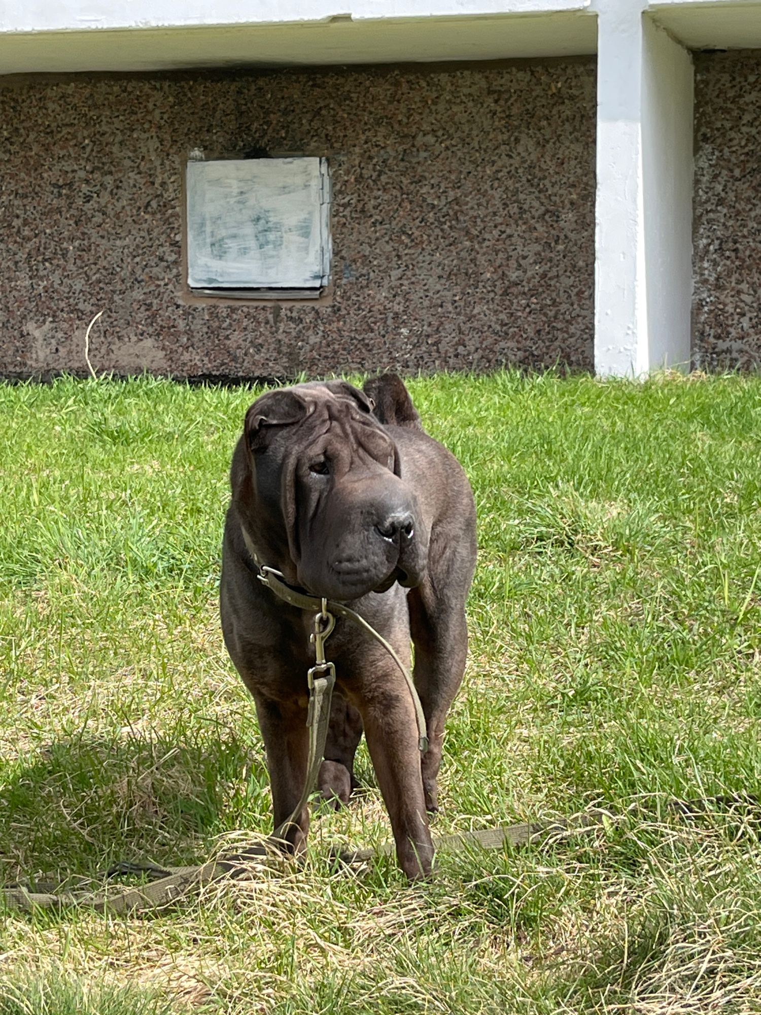 A brown Shar-Pei dog lies on green grass in a yard. The dog wears a green collar and leash. A building with a textured wall, a small door, and white trim is adjacent to the grass. The image appears toβ¦read more