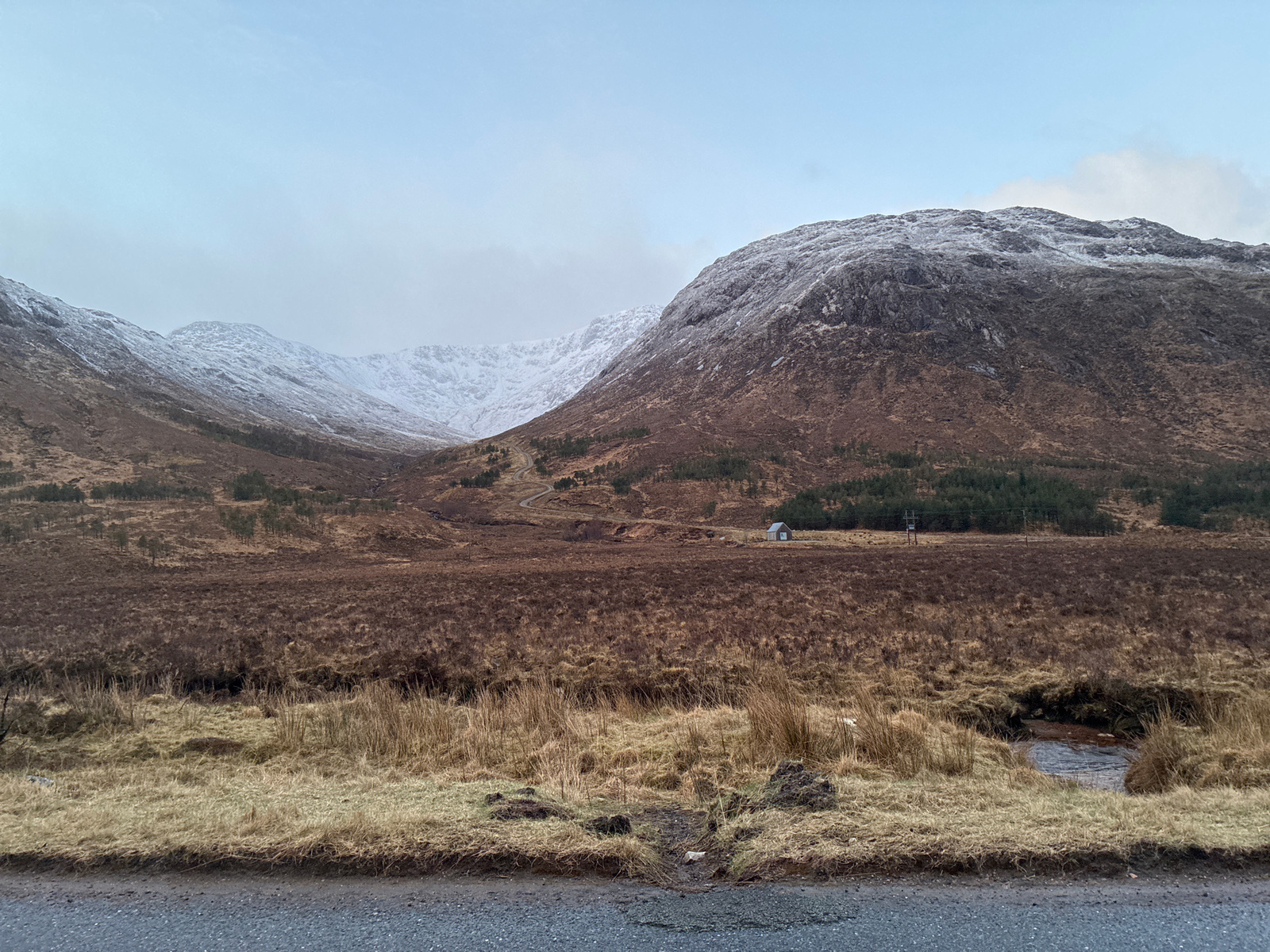 The image depicts a landscape in Fort William, United Kingdom. In the foreground is a stretch of asphalt road. Adjacent to the road is a patch of rough terrain covered in brownish grasses and some bar…read more