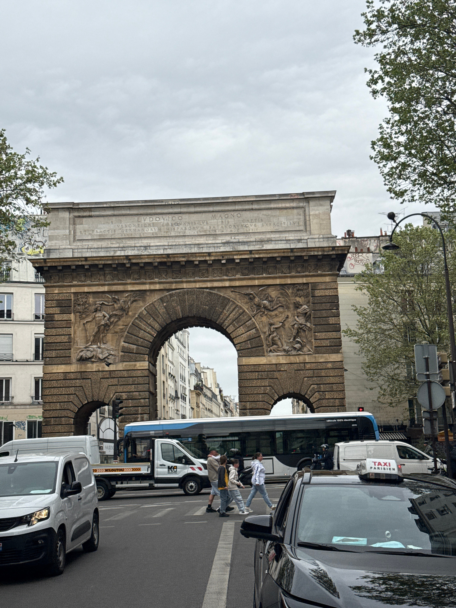 The image shows the Porte Saint-Martin in Paris, France. It is a stone archway with carvings and inscriptions. People are crossing the street in front of it. A white van and a black car are parked nea…read more