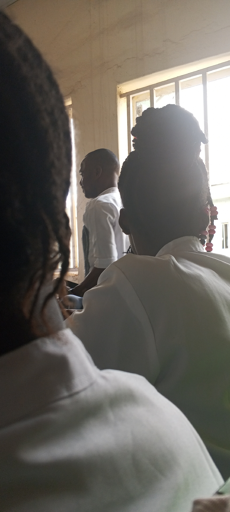 Location: Keffi, Nigeria Description: The photograph depicts three individuals in an indoor setting, likely a classroom or meeting room. The foreground is dominated by the back of a person with dark,…read more