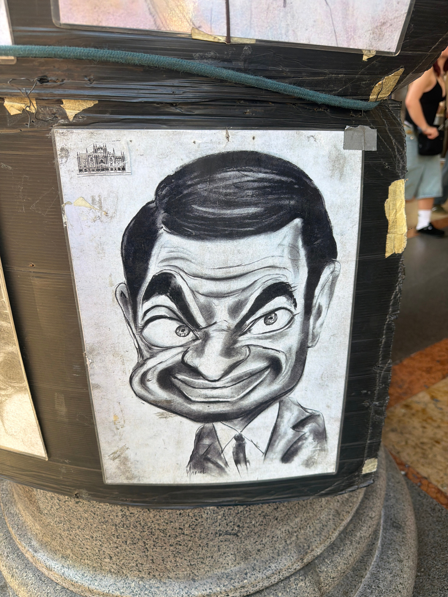 The central element of the image is a black-and-white charcoal drawing of an exaggerated male face, oriented horizontally to the left. The caricature features wide, round eyes with prominent pupils, a…read more