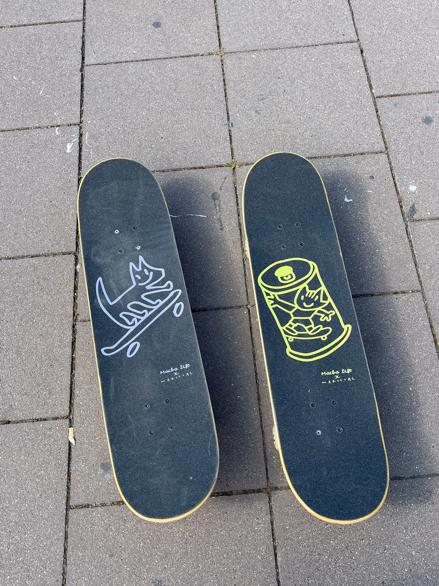 Two skateboards rest on a paved surface of gray rectangular bricks. The top skateboard features a graphic of a yellow can with a cartoon figure inside. The bottom skateboard has a graphic of a white a…read more