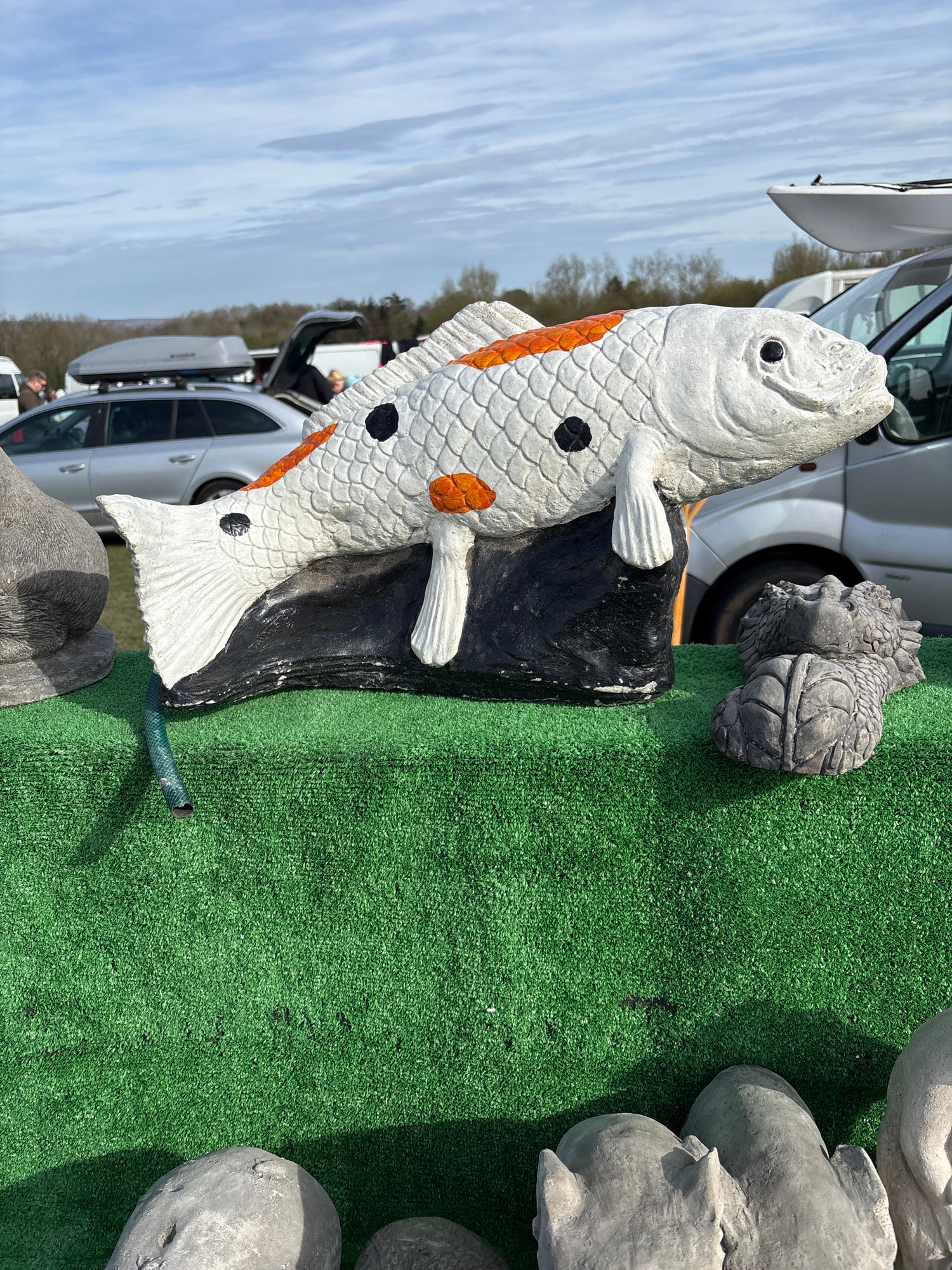 The image shows a collection of garden ornaments displayed on artificial grass. There is a large, upright concrete koi carp statue, white with orange and black markings, standing on a black base. To t…read more