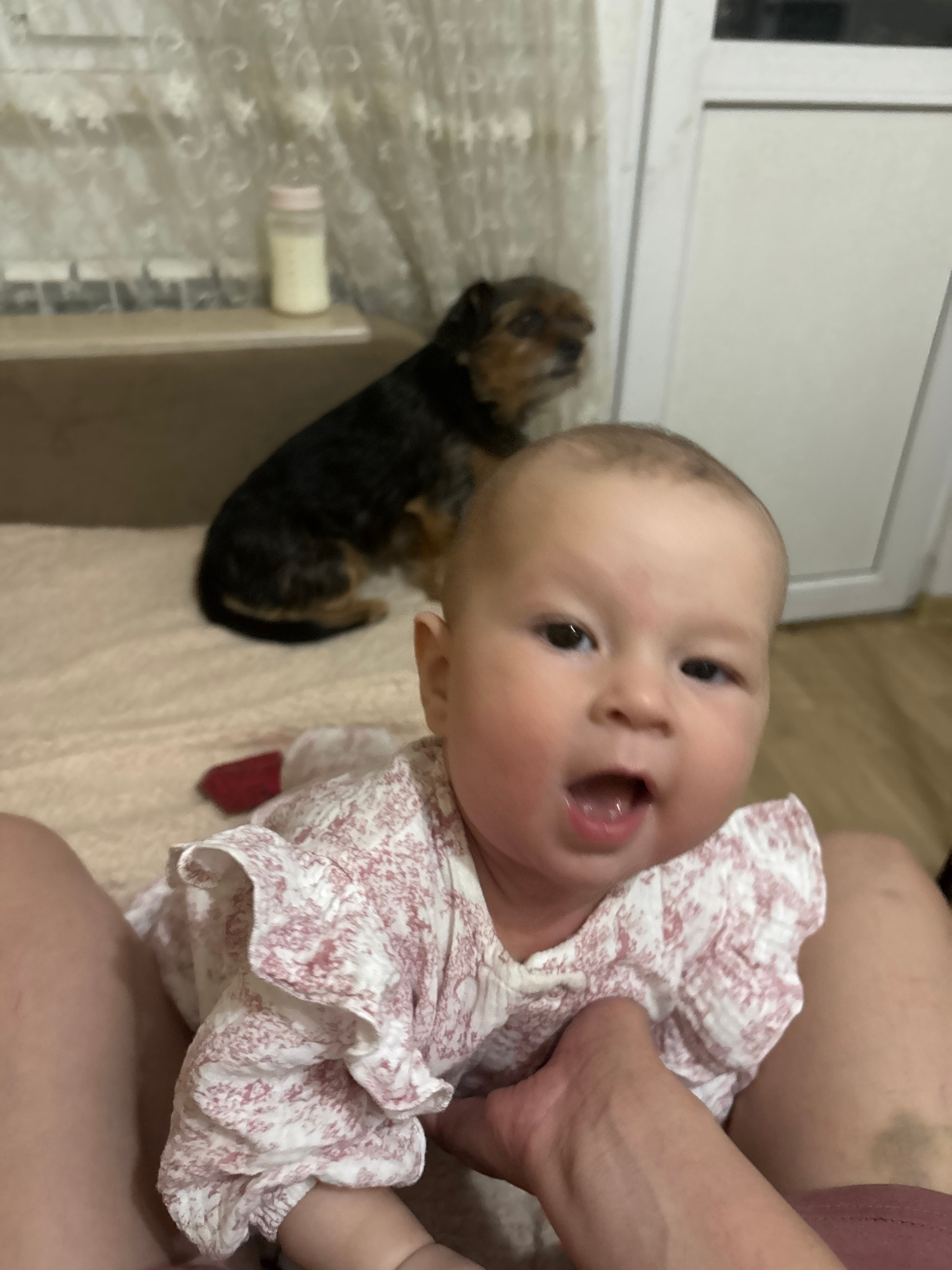 A baby is held in someone's arms, wearing a white and pink floral patterned dress. The baby is looking at the camera with their mouth open. To the left, a small dog is lying on a beige surface, near a…read more