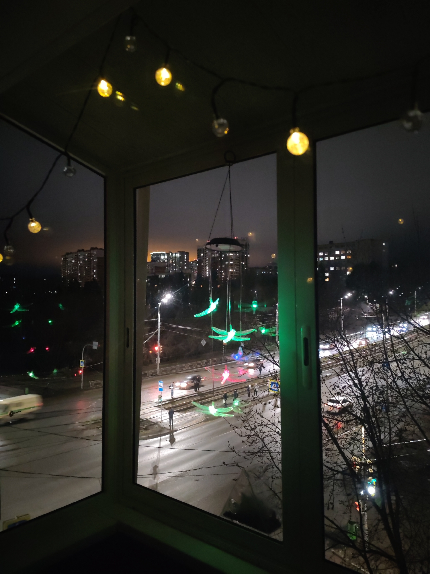 A nighttime view from an indoor window showing a street scene in Izhevsk, Russia. The scene includes a road with cars and pedestrians crossing at crosswalks. Trees are visible on the right side of theβ¦read more