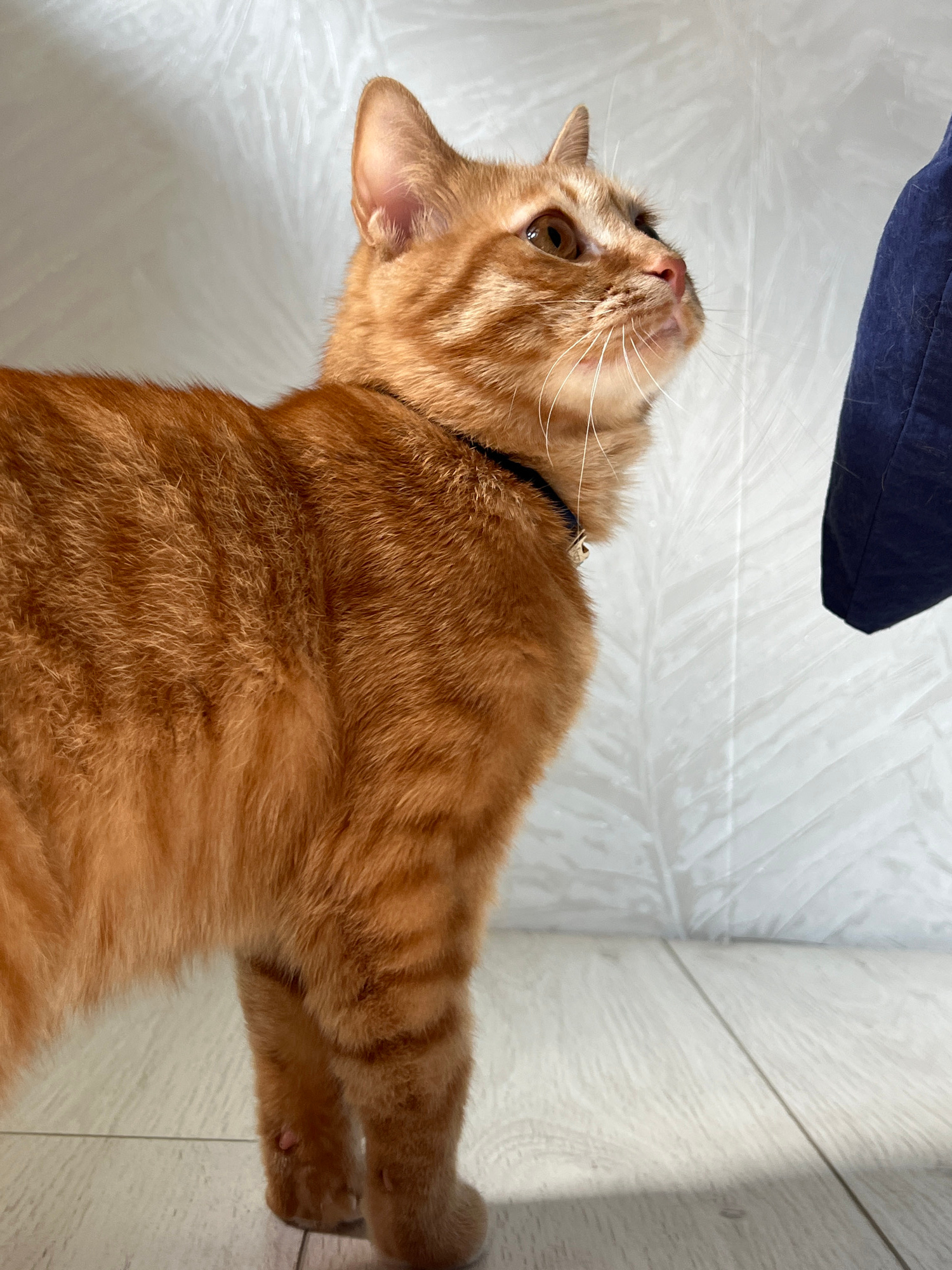 An orange tabby cat with a black collar is lying on a white tile floor. A dark blue object is partially visible in the top left corner of the image. The cat is looking upwards. There is no evidence in…read more