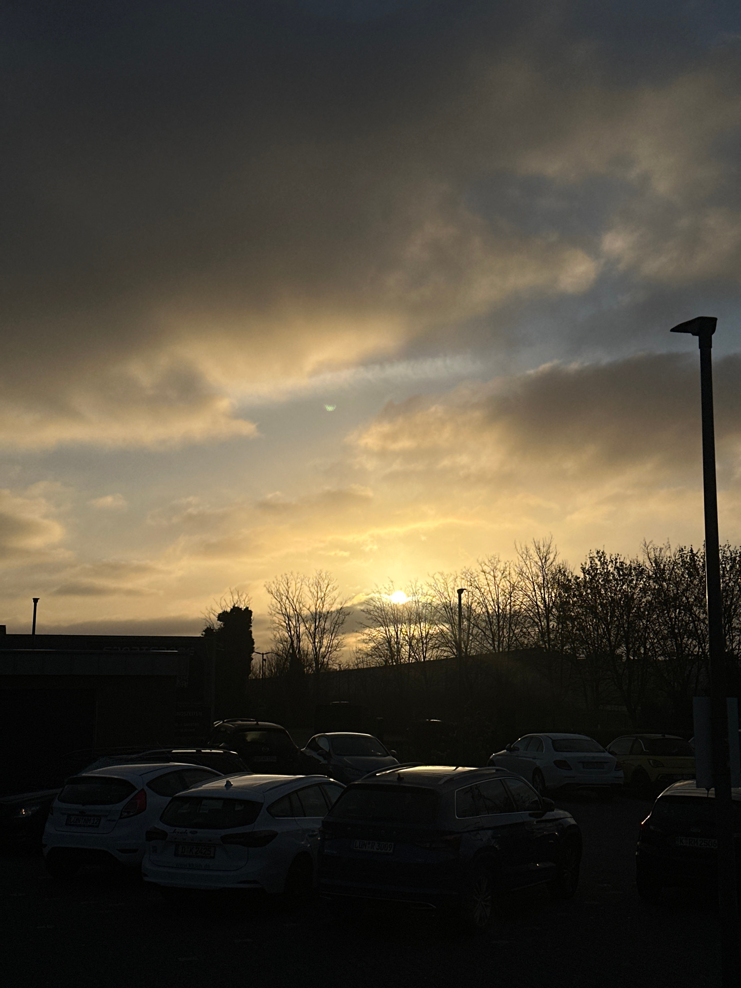 The image shows a parking lot in Holzwickede, Germany at sunset. Several cars are parked closely together in the foreground. Trees, mostly bare of leaves, line the edge of the parking lot. The setting…read more