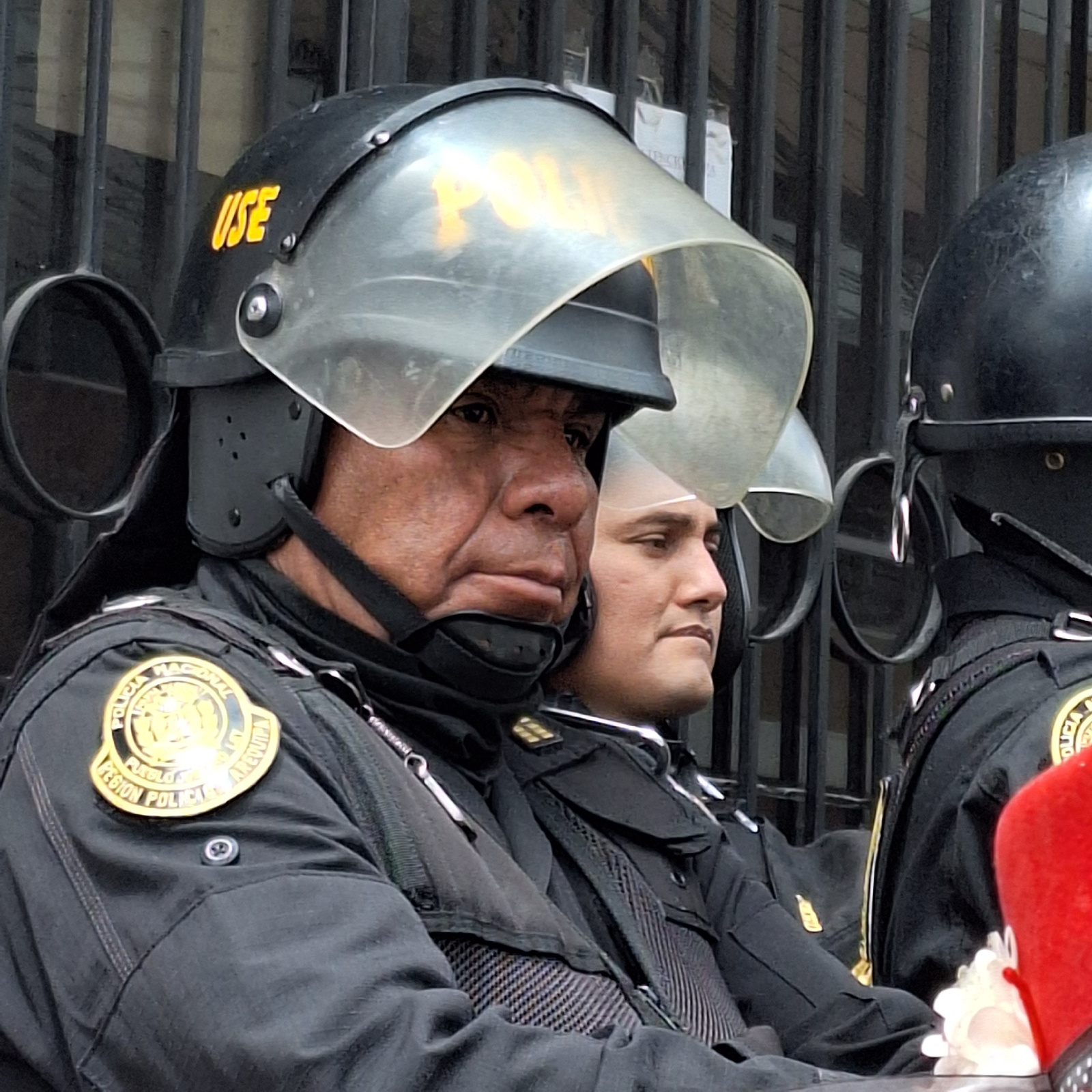 Two police officers are wearing riot gear, including helmets with face shields. The gear includes a round badge on their uniforms. The location is Miraflores, Peru. | Open Wire