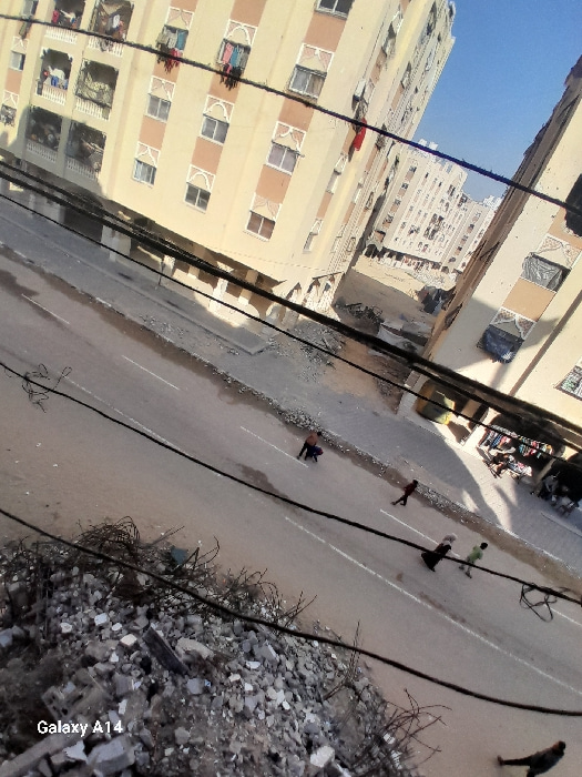 An elevated, tilted view captures a street scene in the city of Khan Yunis, Palestinian Territory. In the immediate foreground, a substantial pile of concrete rubble and exposed rebar occupies the bot…read more