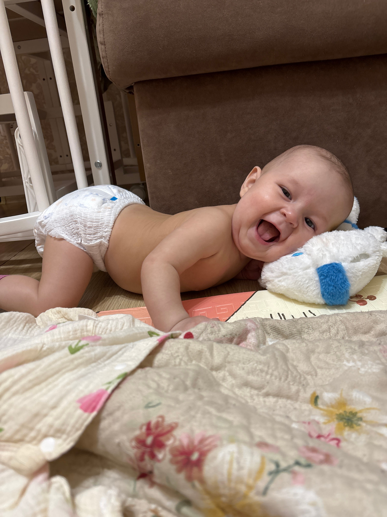 A baby is lying on a surface with a floral-patterned cloth nearby, appearing to be a blanket. The baby is wearing a diaper and is smiling broadly. A white plush toy with blue accents is next to the ba…read more