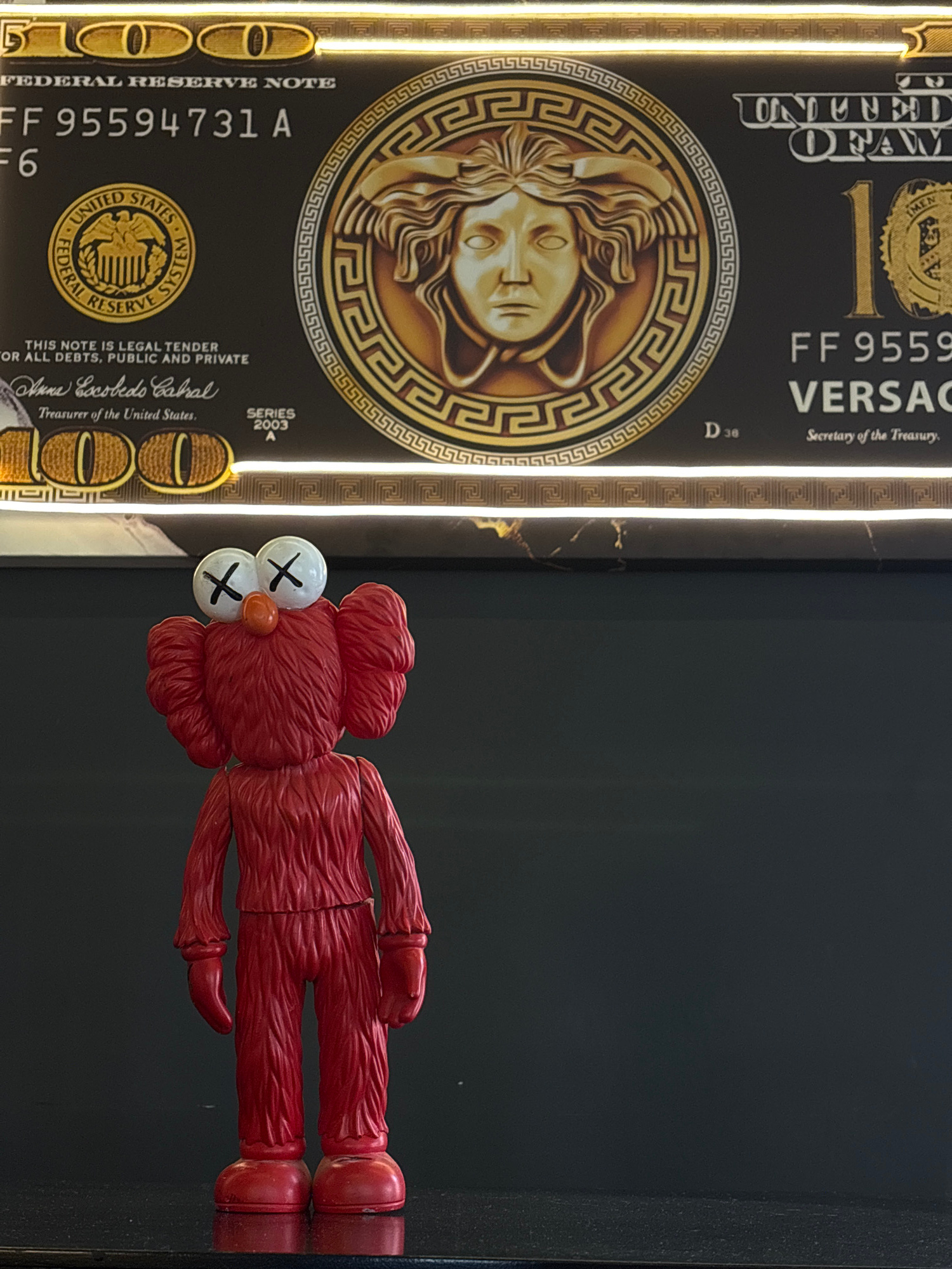 A red KAWS figurine, with "X" marks for eyes, is positioned in front of a framed Versace-themed decorative note. The note is black and gold, mimicking the design of a US dollar bill, but with Versace…read more