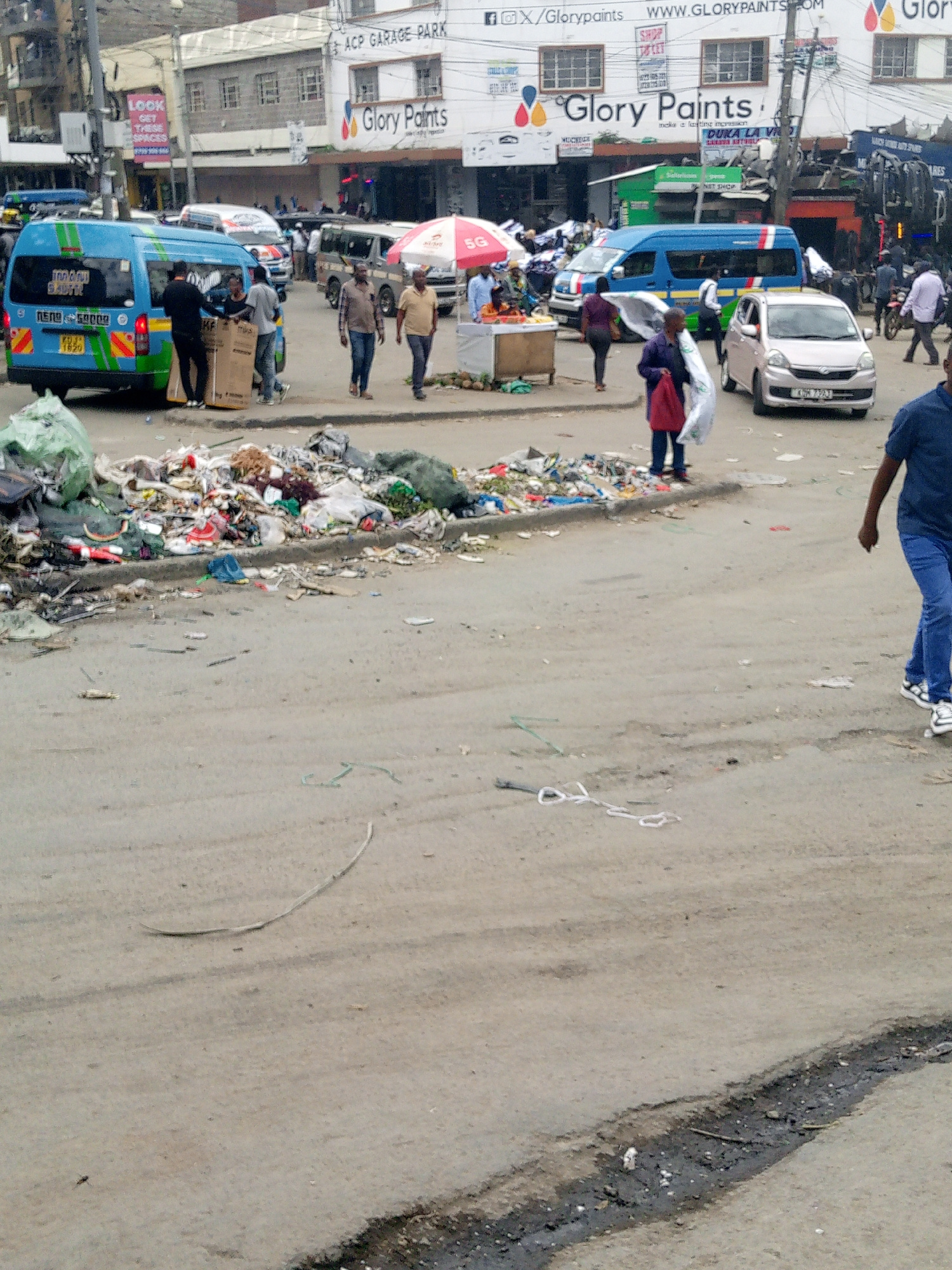 The image shows a busy street scene in Nairobi, Kenya. The street is littered with garbage. Several people are walking or standing near the garbage pile. There are various vehicles, including a "matat…read more