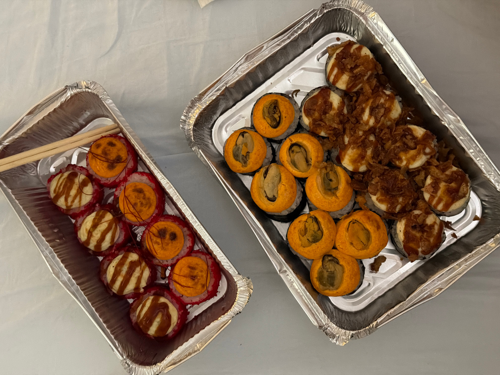 The image shows two foil containers of sushi rolls. The container on the left contains rolls with red rice and toppings in shades of orange and white with brown drizzling. A pair of chopsticks rests o…read more