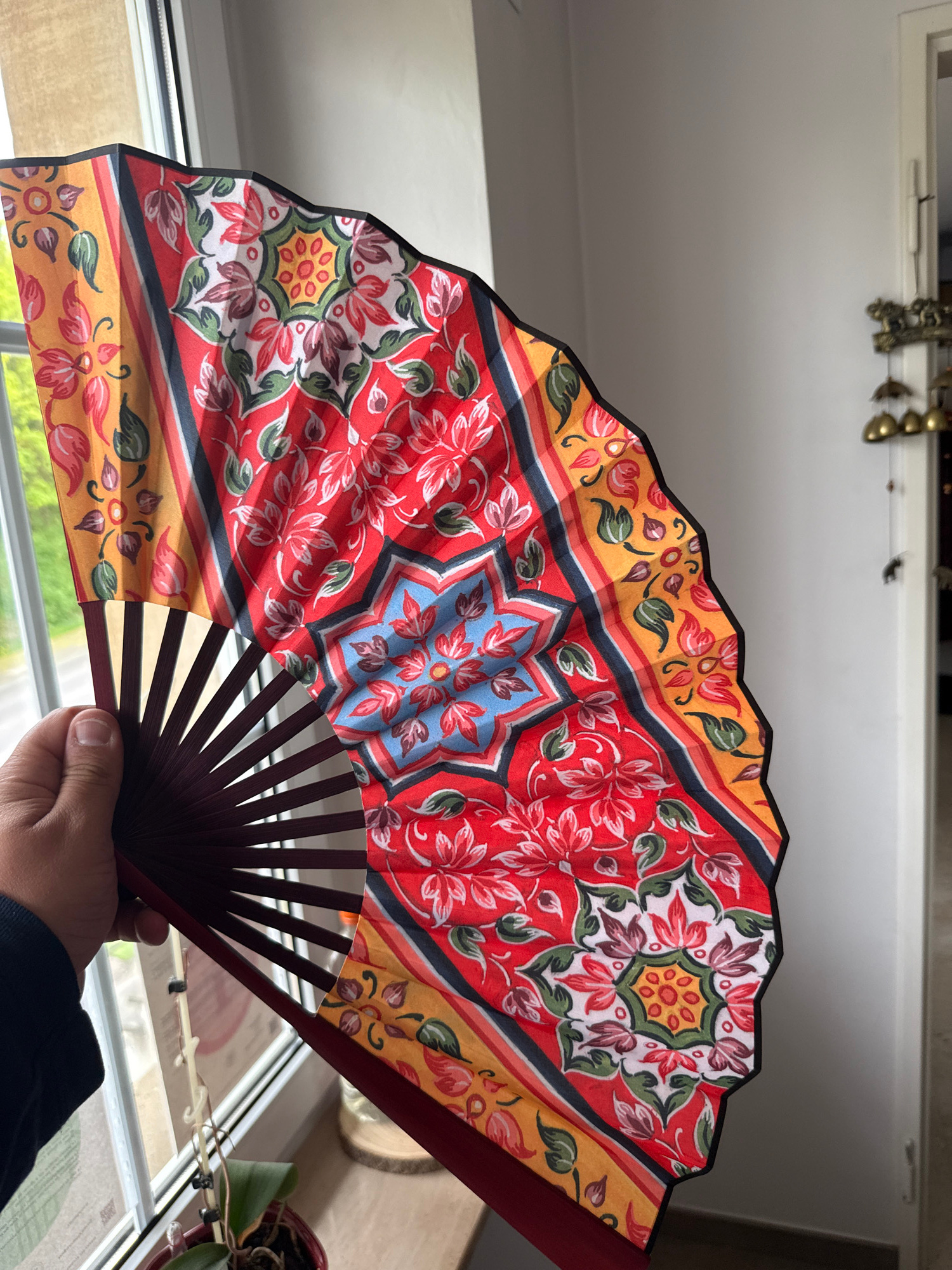 A person is holding a decorative hand fan with a floral pattern. The fan is primarily red, yellow, and blue. The blades of the fan are dark brown or red-brown. The background consists of a window and…read more
