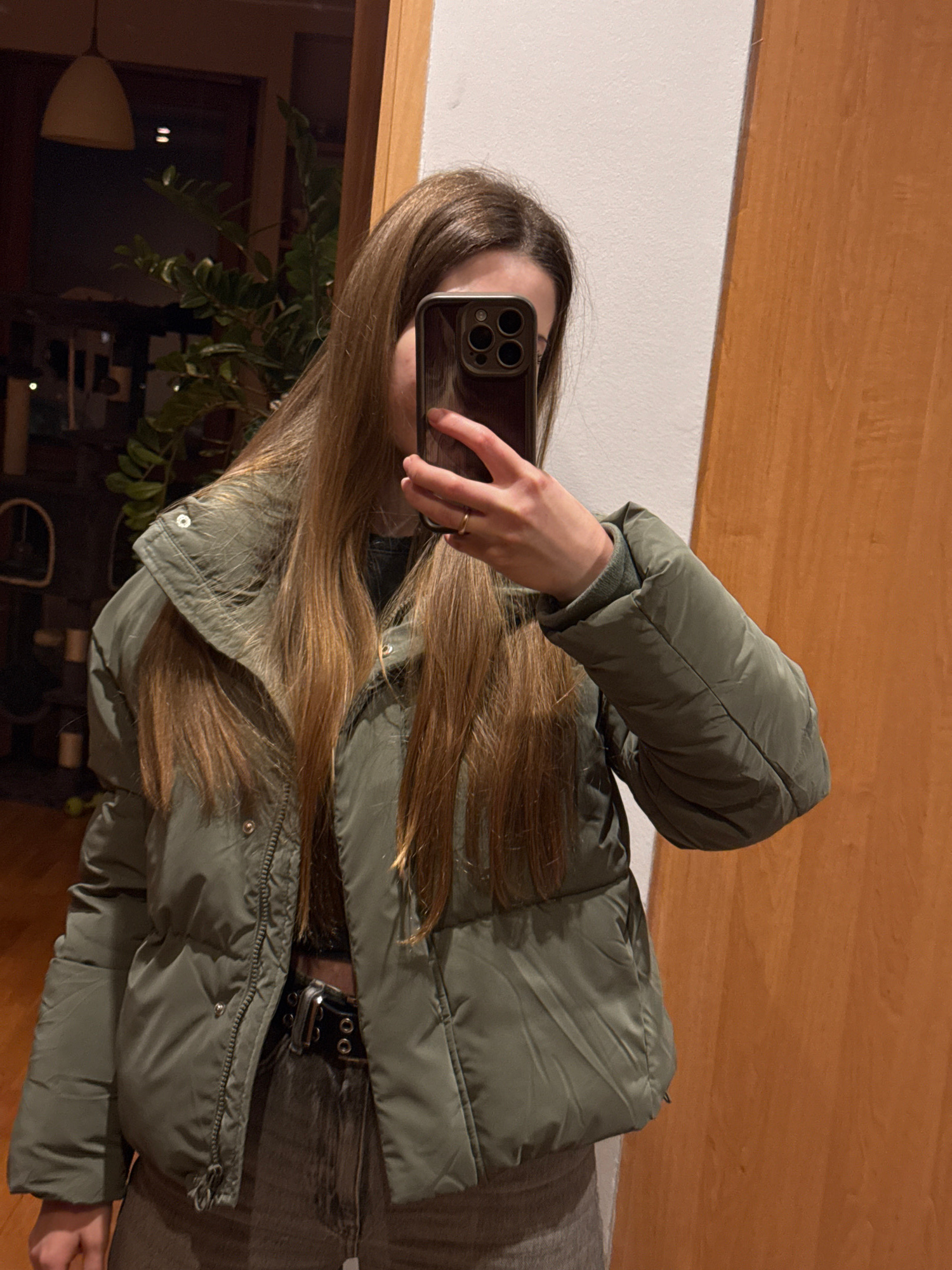 A person takes a selfie in front of a mirror. The person is wearing a light green puffer jacket and a gray sweater. They are holding a smartphone to take the picture. Their hair is light brown and lon…read more
