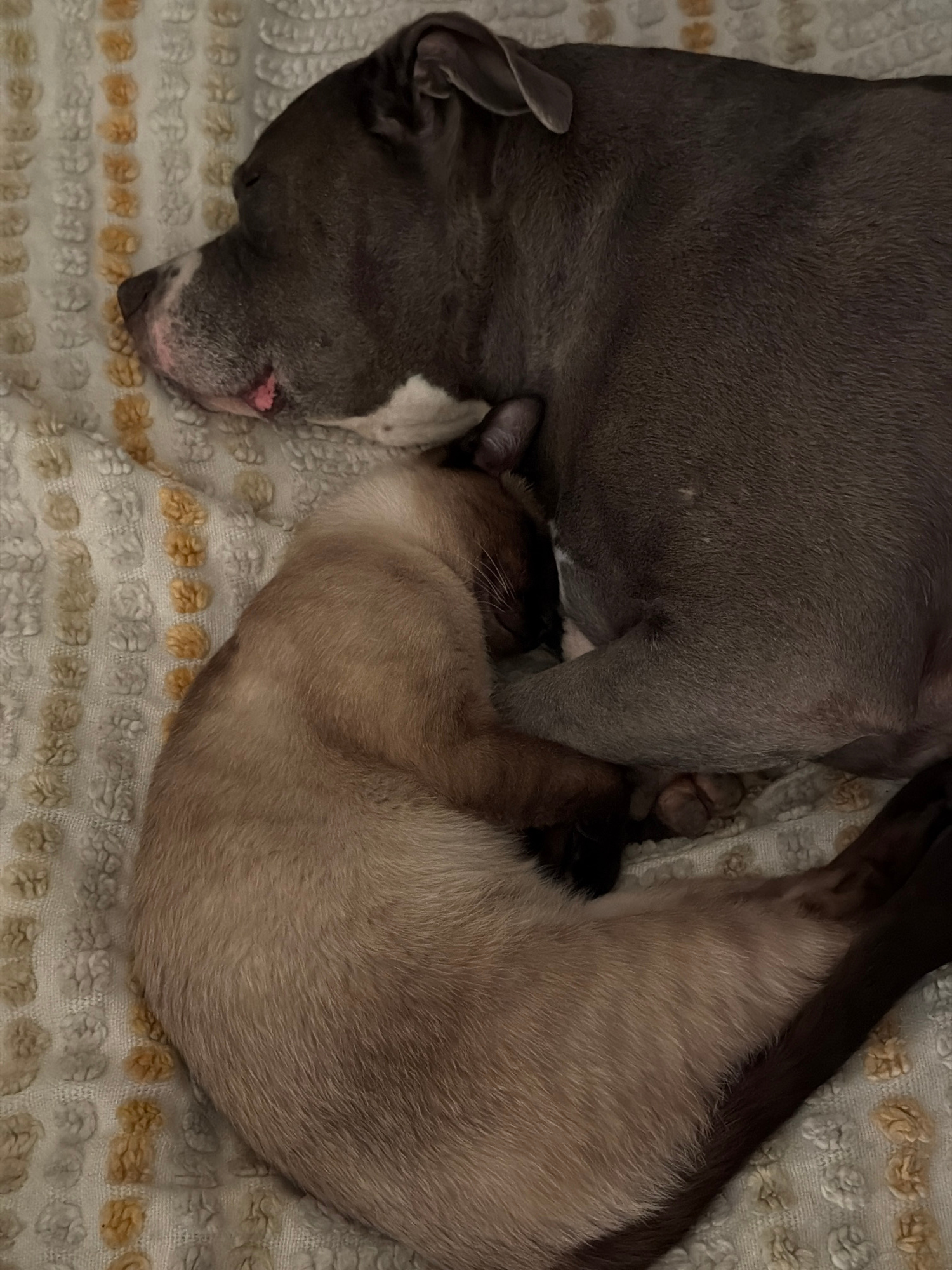 A gray pitbull-type dog and a Siamese cat are curled up together on a textured blanket. The dog's head is on the left side of the frame, and the cat is curled into a crescent shape on the right. The b…read more