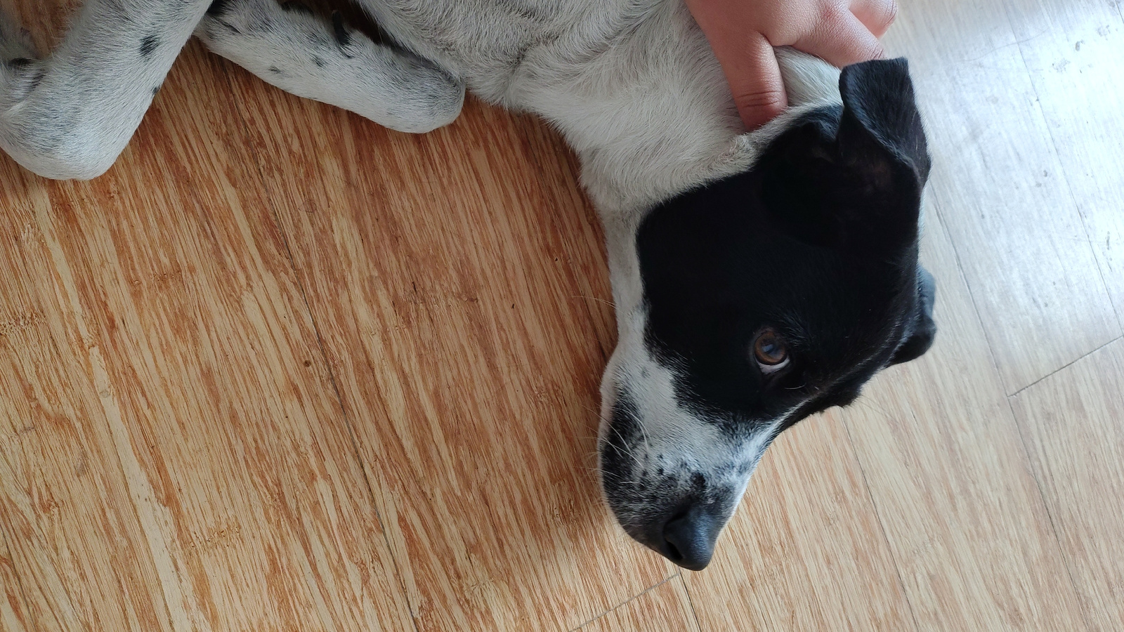 A dog with a black and white coat is lying on a wooden floor. A hand is touching the dog's neck. The background suggests an indoor environment. There is no indication of the location being in Chorrill…read more
