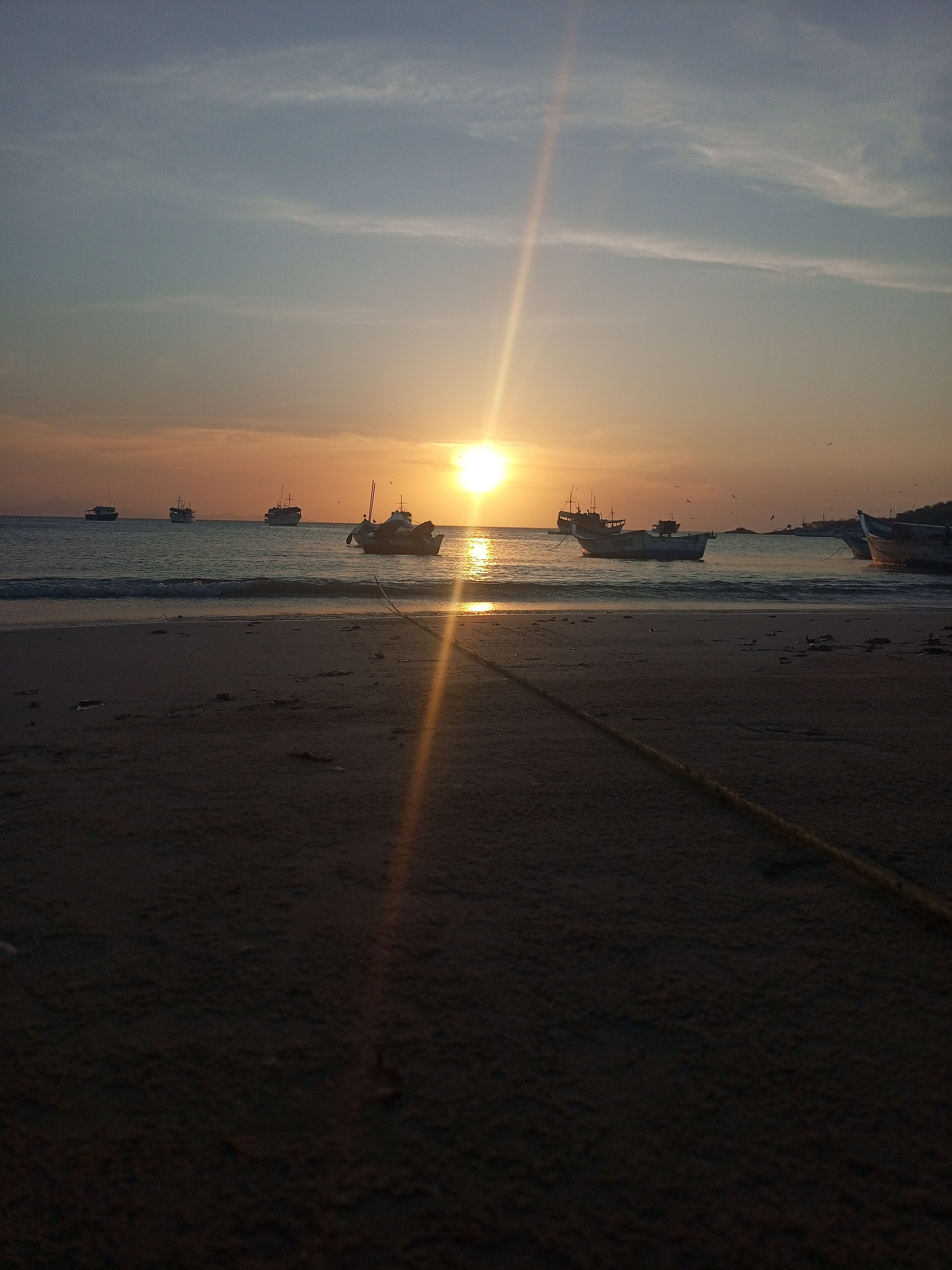 The image depicts a sunset scene at a beach in Juan Griego, Venezuela. The sun is setting over the ocean, casting a bright glare and a golden light across the water and sand. Several fishing boats are…read more