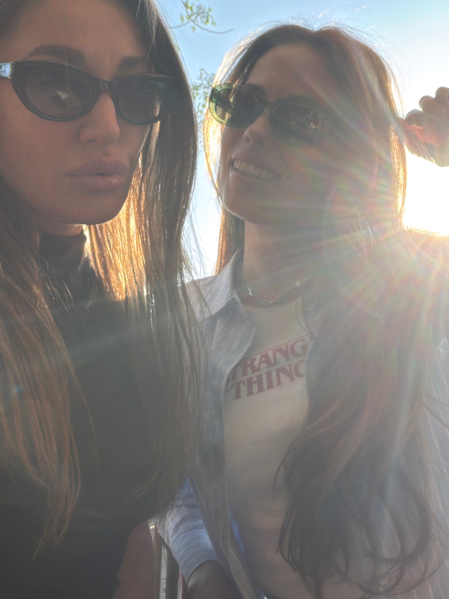 The image is a low-angle, sunlit photo of two women wearing sunglasses. The woman in the top portion of the frame is smiling and wearing a white T-shirt with red text that reads "STRANG THINGS" (possi…read more
