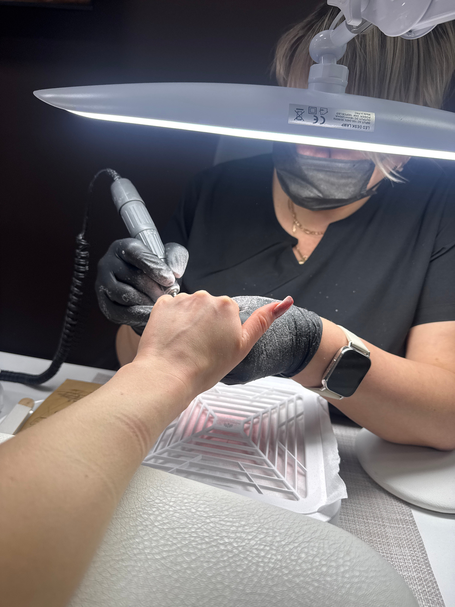 This image depicts a professional nail service taking place in a nail salon in Unknown, Unknown. The scene is primarily focused on the hands of two individuals under a bright LED desk lamp. One indiv…read more
