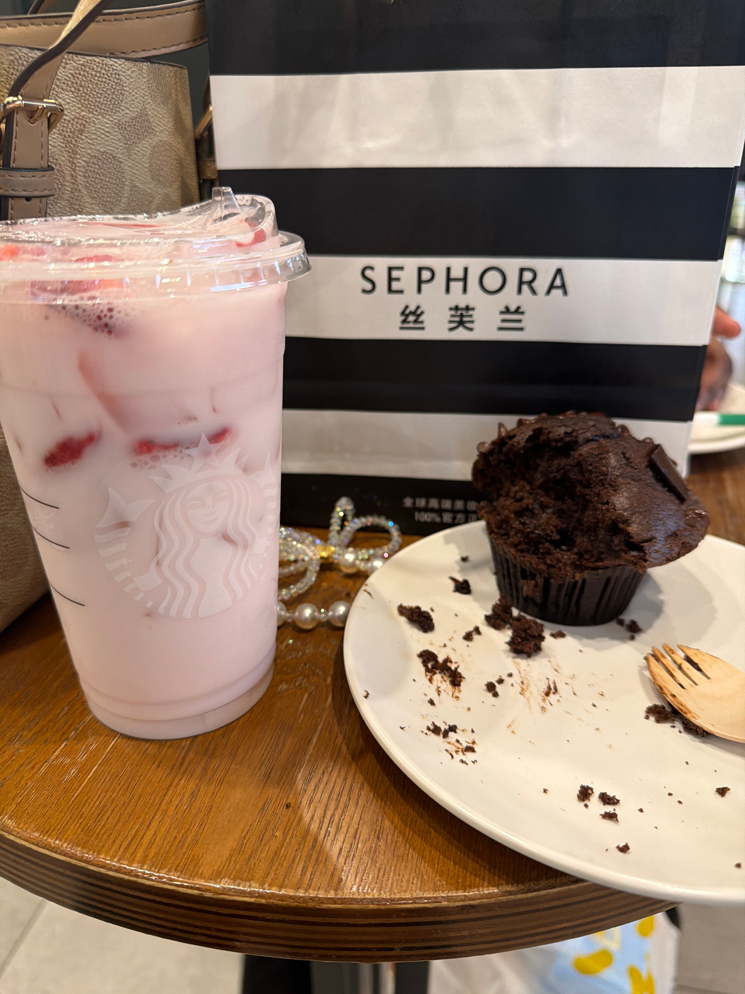 An overhead shot captures a collection of items on a wooden table, suggesting a casual break or outing. The scene features a partially eaten chocolate muffin, a pink beverage in a Starbucks cup, a Sep…read more