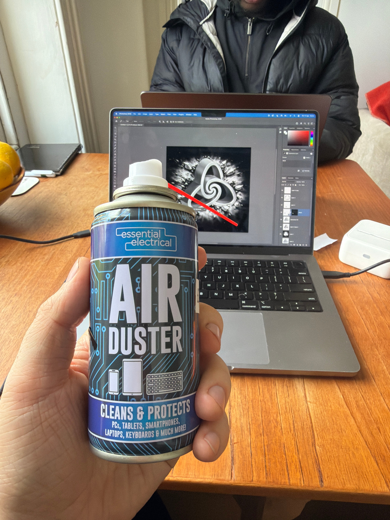 A person is holding a can of "Essential Electrical Air Duster" in front of an open laptop displaying an image being edited in Adobe Photoshop. The laptop rests on a wooden desk. A white charging block…read more