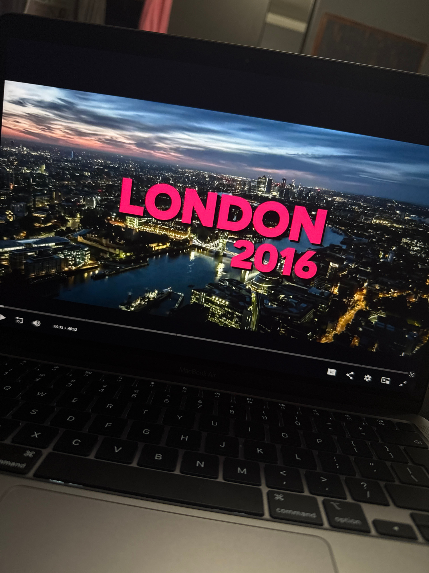 The image shows a laptop displaying a scene of London at night, with the text "LONDON 2016" overlaid in pink. The aerial view of London shows a river cutting through the city, which is illuminated by…read more